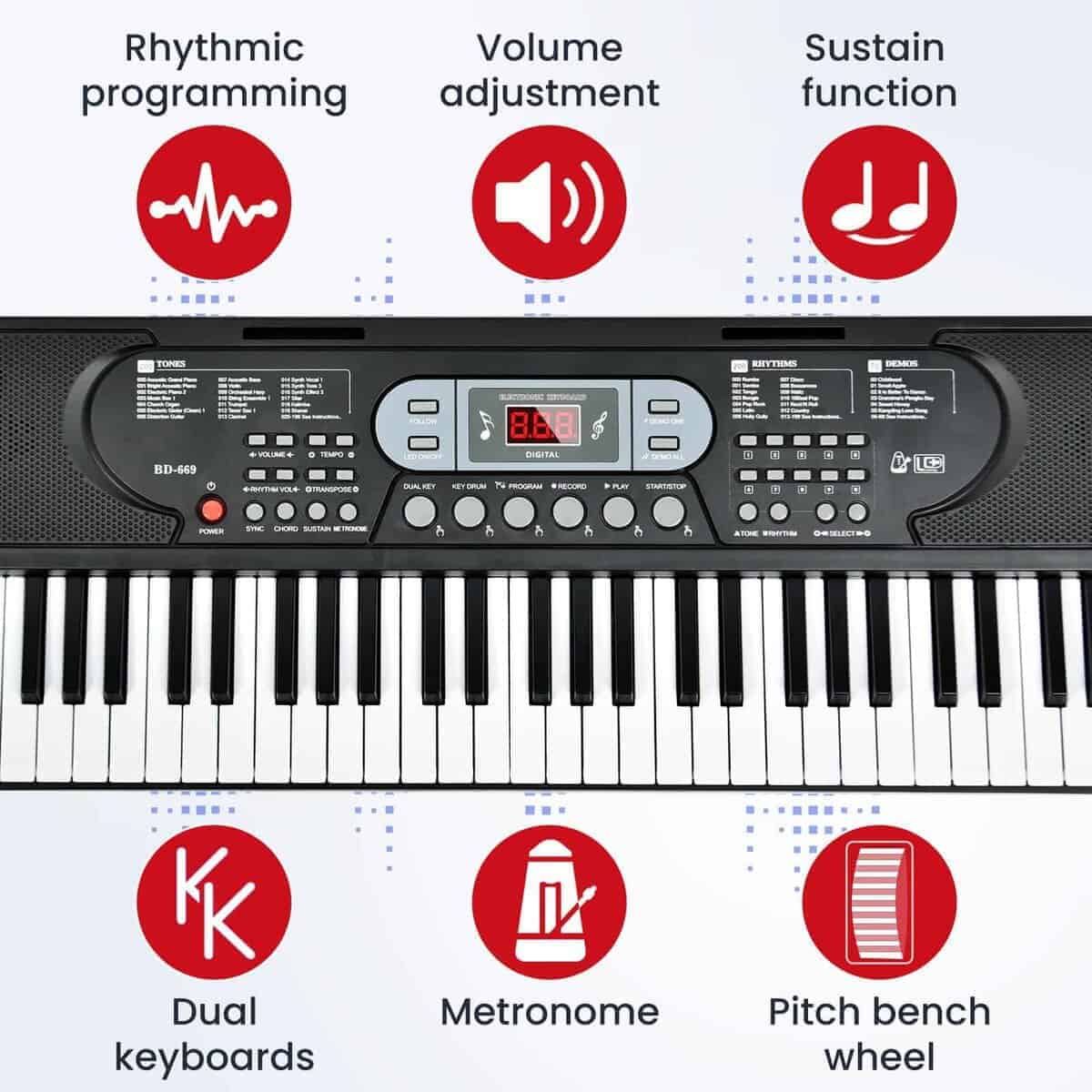 3. Multifuncional – El teclado de piano eléctrico tiene un modo de teclado dual y una rueda de curva de tono, ofreciendo 200 tonos y 200 ritmos, brindando posibilidades para la creación musical. El piano eléctrico tiene funciones de grabación y reproducción, lo que te permite mejorar tus habilidades o tocar tus canciones favoritas.