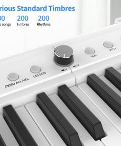 Paleta de sonidos diversa e inspiradora: Libera tu potencial creativo con una amplia variedad de opciones de sonido, que incluyen 128 voces e instrumentos diferentes y ritmos. Esta versatilidad te permite explorar y experimentar con una variedad de estilos musicales. Sumérgete en el mundo de la música con 80 canciones demo incluidas, que sirven como un valioso recurso para la práctica y la interpretación, enriqueciendo tu repertorio musical y brindándote inspiración.