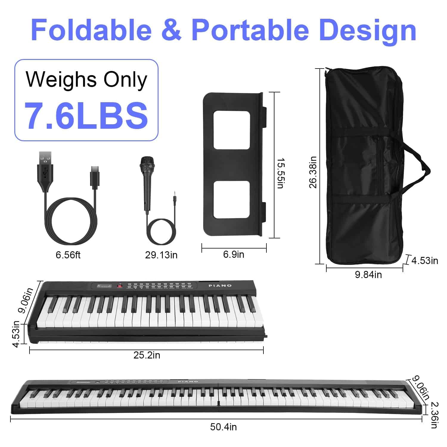 Teclado de música multifuncional equipado con pantalla LCD, 200 tonos, 200 ritmos, 80 demos, Transpose, Dual Keyboard, Keyboard Drum, Lesson, Sync/Velocity, Synthetic Chords, Fill-In, Record, Sustain y función de metrónomo, el teclado de piano plegable puede satisfacer perfectamente las necesidades de práctica habituales de los principiantes. La función de teclado dual permite dividir el piano en dos partes, y dos personas pueden tocar en un solo piano. Conveniente para llevarlo a cualquier lugar y en cualquier momento que desee. El teclado de piano de 88 teclas pesa solo 7.6 libras, por lo que puede moverlo fácilmente. También puede doblarlo a solo 25.2×9.06×4.53in y guardarlo en la bolsa de transporte incluida para facilitar el transporte. Teclado completo de 88 teclas semi pesadas: el piano digital con 88 teclas estándar que incluyen 52 teclas blancas de 5.5×0.9in y 36 teclas negras de 3.15×0.4in, proporcionando un toque y profundidad de tecla similar a un piano real y permitiéndole disfrutar inmersamente de tocar el piano. Puertos múltiples: el teclado de piano electrónico cuenta con un conector para auriculares de 3.5 mm, una entrada de audio de 3.5 mm, una entrada de micrófono de 3.5 mm, un puerto de pedal de sustain de 3.5 mm, lo que satisface ampliamente las necesidades básicas de grabación y reproducción como un piano digital y proporciona una mejor experiencia de entrenamiento. Diseño considerado: viene con un micrófono, un palo de teclas de piano, un atril de partituras y una bolsa de transporte, configure su escenario y comience su actuación en casa o afuera. Un regalo perfecto para principiantes amantes de la música.