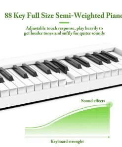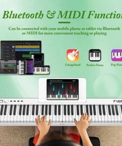 El teclado de piano digital está equipado con 88 teclas semipesadas de alta calidad, con un ratio de 1:1 de las teclas de piano, proporciona un toque cómodo y una profundidad similar en las teclas. Cuenta con dos altavoces de alta calidad que simulan el sonido de un piano real, mejorando tu interpretación musical. Además, admite funciones Bluetooth y MIDI, permitiendo la conexión con dispositivos móviles para enseñar o tocar de forma más conveniente. Incluye teclado de piano plegable Fverey, bolsa de almacenamiento, atril y pinza para partituras, pedal de sostenuto, adaptador y cable USB.