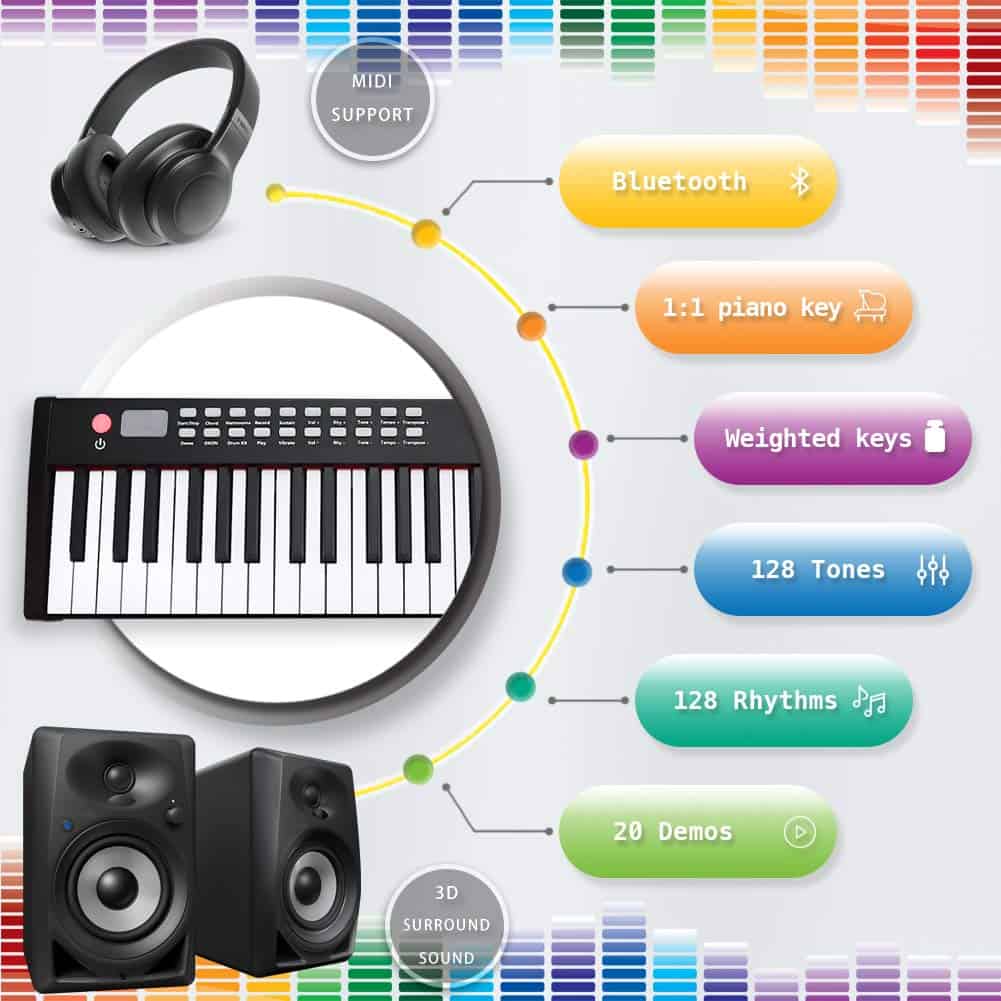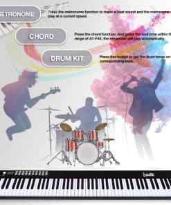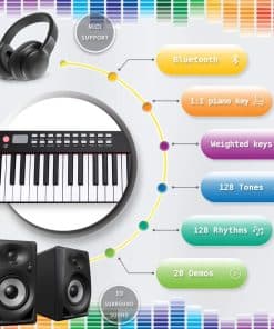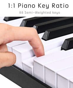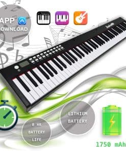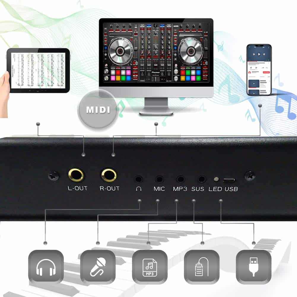 1. Teclado de piano eléctrico de tamaño completo: el teclado digital iLearnMusic cuenta con 88 teclas semipesadas estándar (relación 1:1 de teclas de piano), permitiendo la adaptación de los dedos y un sonido preciso. Fabricado con plástico ABS premium para garantizar la suavidad adicional de las teclas y un brillo duradero. 2. Teclado eléctrico multi funcional: el teclado electrónico iLearnMusic es un instrumento de teclado musical altamente funcional con múltiples funcionalidades que incluyen: interfaz de controlador MIDI/USB, 128 ritmos y tonos, 20 canciones de demostración, pedal de sustain, así como conectividad por bluetooth para APP. 3. Perfecto para todas las edades: este teclado de 88 teclas está hecho de aleación de aluminio premium que garantiza una estructura confiable para un uso prolongado. Perfecto teclado electrónico de aprendizaje para adultos, niños, principiantes, amantes de la música y usuarios de todos los niveles de habilidad. Ideal para entornos de enseñanza en el aula y en grupo. 4. Aprendizaje habilitado por APP: este teclado de piano de 88 teclas contiene muchas otras funciones avanzadas disponibles, como la Enseñanza Habilitada por APP, que permite a los estudiantes practicar junto con una aplicación descargable gratuita. 5. Larga duración de la batería: nuestros teclados electrónicos cuentan con altavoces dinámicos incorporados de primera calidad y batería de litio premium. Una carga completa permite hasta 12 horas de tiempo de reproducción. Simplemente conéctelo a una fuente de alimentación para recargar.