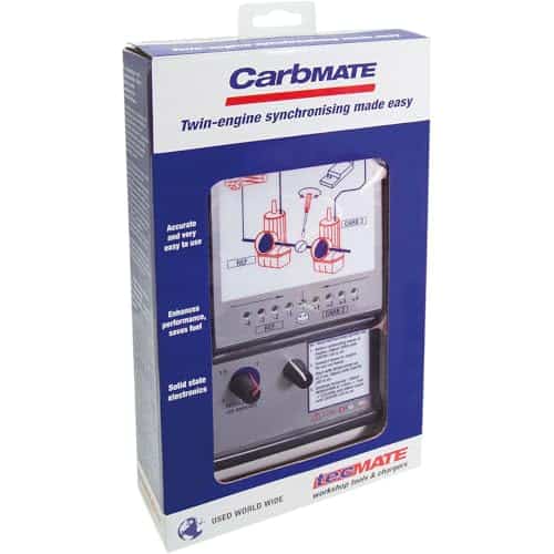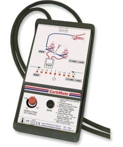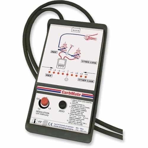 CarbMate, la alternativa electrónica rentable a los mercurio, con la ventaja de la medición electrónica de estado sólido que no se rompe si se cae. CarbMate muestra la diferencia en la configuración de vacío de entrada de dos carburadores separados (o válvulas de aceleración de inyección de combustible) en el mismo motor de manera muy precisa en una única pantalla LED transversal fija este-oeste de 9 resoluciones. Un solo LED verde en el centro muerto, marca el rostro feliz, indica que los vacíos del colector comparados son iguales dentro de la resolución seleccionada. Características clave: Precisión de resolución ajustable de 2 a 0.5cmHg, 0.5cmHg como recomiendan los OEs de motocicletas y motores marinos fueraborda. Transductor de presión industrial/médico MOTOROLA aprobado como herramienta recomendada por el club oficial de aviación de ROTAX, ROAN. (Ver video). Hay disponibles kits especiales de ROTAX. CILINDROS: 2 (4 posibles con adaptador de 2 a 4 cilindros) MÉTODO: Comparar y mostrar en una pantalla única la diferencia de presión entre dos colectores de carburador/inyección de combustible. PANTALLA/RESOLUCIÓN: 1 pantalla de 9 x LED de alto brillo, ajustable hasta una resolución de 0.5cmHg. AJUSTE: RANGO: resolución de 2 a 0.5cmHg CERO: centrar el valor mostrado antes de sincronizar. POTENCIA: 12V CC (11 a 15 VCC), la energía se puede extraer de la batería del vehículo. ESTILO/INCLUIDO: Estuche de instrumentos de ABS con etiquetas de policarbonato duraderas, mangueras de goma resistentes al combustible y aceite, enchufe de alimentación de CC con un cable de alimentación de 6 pies y medio / 200 cm que termina en pinzas de la batería, instrucciones de uso (en el instrumento y proporcionadas). OPCIONES: Funda de goma protectora, adaptador de 2 a 4 cilindros (requiere funda protectora), opciones de extensor de cable de alimentación y adaptador, adaptadores de colector M5 y M6, división de vacío en T para interruptor de combustible, estuche de transporte de nylon, adaptadores ROTAX, kits ROTAX. garantía limitada de un año.