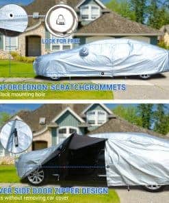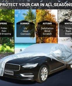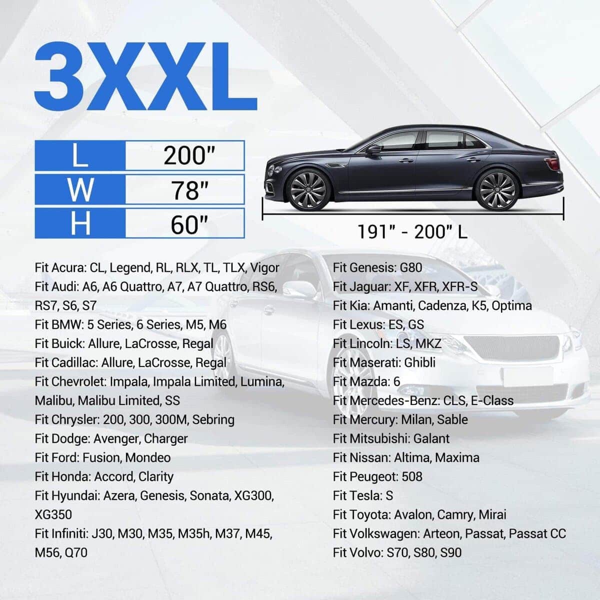La cubierta de coche impermeable Tecoom viene con un forro interior suave y grueso, proporciona protección completa para tu vehículo contra los rayos UV, arena, polvo, hojas, nieve, lluvia, heladas, excrementos de aves y condiciones climáticas extremas. Perfecto para uso en exteriores e interiores. Tamaño de la cubierta: 3XXL universal se ajusta a sedán con una longitud de 191″-200″. Por ejemplo, se ajusta a Audi: A6/A7, Mercedes-Benz CLS, Tesla S, Chevrolet Impala, Ford Fusion, Honda Accord, Toyota Avalon, etc.