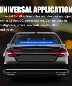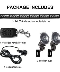 Lista de empaque: 1 x Barra de luz estroboscópica LED azul 1 x Control remoto inalámbrico (modelo de batería CR2016, BATERÍA DE LITIO 3V) 1 x Encendedor de cigarros 6 x Ventosas 2 x Soportes de montaje 1 x Longitud del cable 13 pies 1 x Accesorios Consumo de energía: 24 vatios con un total de 24 LED; Características: Resistente al agua pero no sumergible; 13 patrones de destello seleccionables; Cable de extensión de 13 pies (4 m) para montaje en vehículos compactos y grandes; Unidad LED autocontenido, no se requiere un flasher externo; Incluye patrones de destello direccionales (izquierda, derecha y centro); Función de memoria de modo para recordar el último patrón; 24 LED de alta intensidad con lentes ópticas anchas para máxima intensidad; Soportes de montaje ajustables en ángulo; Ranuras de montaje de 1/4 en la parte posterior para montaje con tornillo deslizante;
