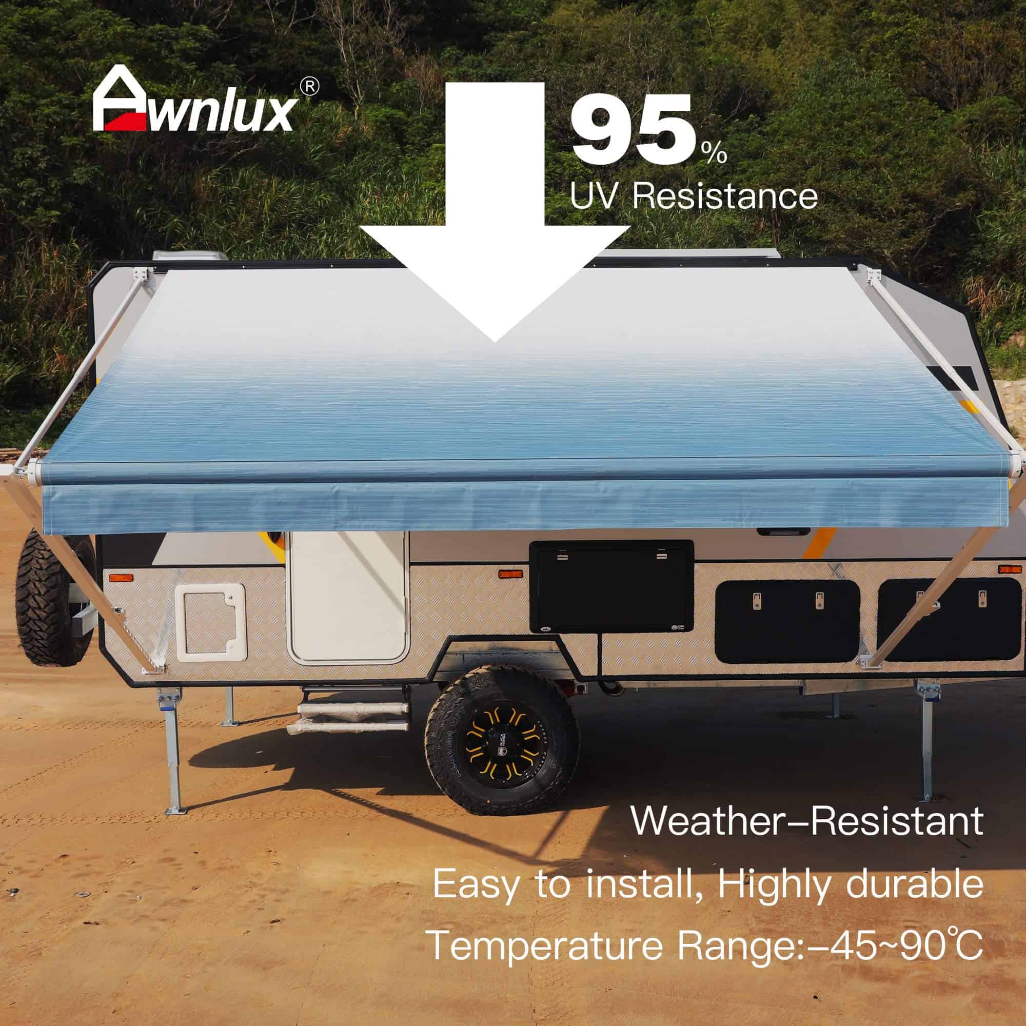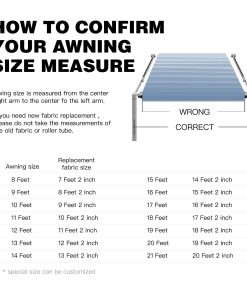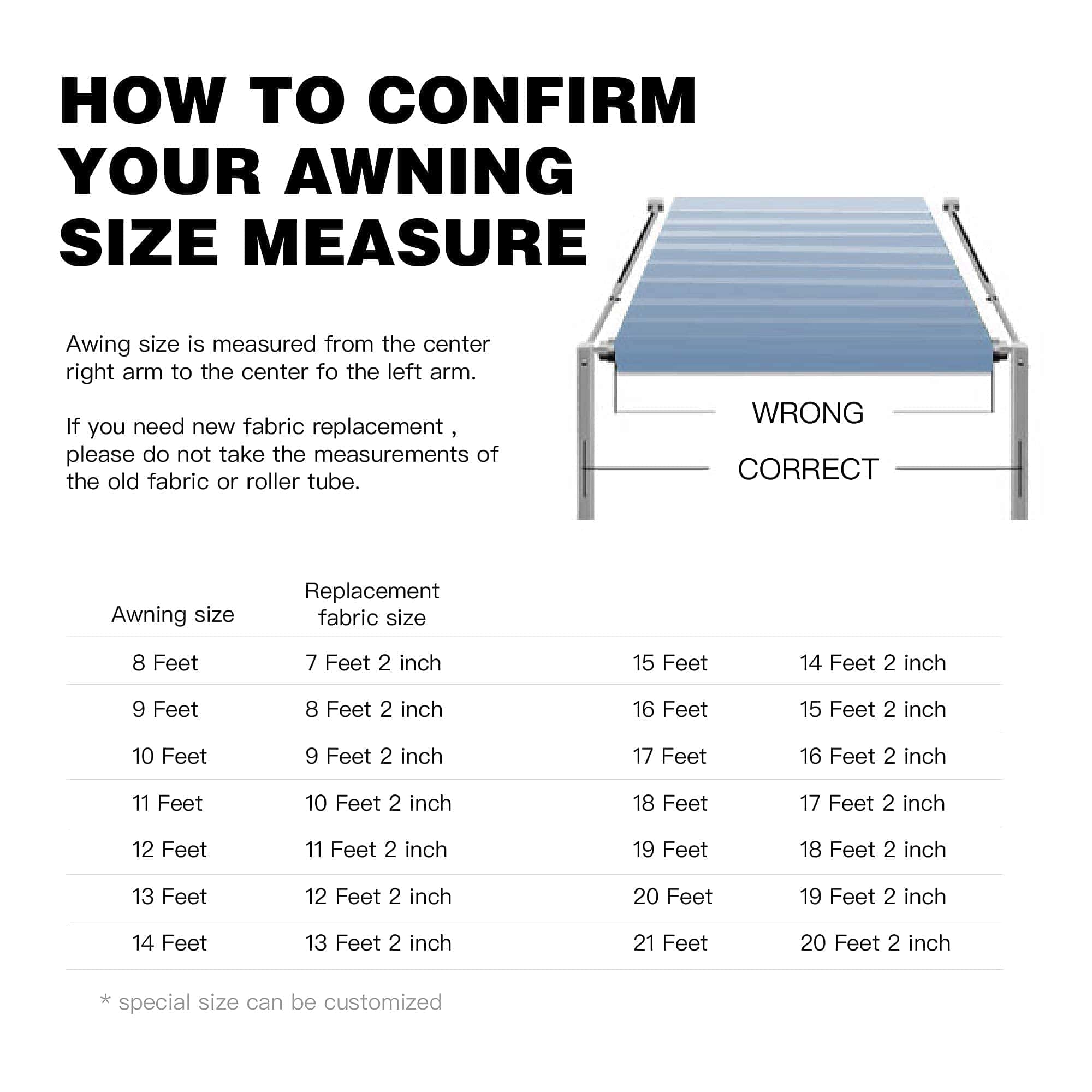 Tela de repuesto para toldos de RV Awnlux para toldos Carefree, Dometic (A&E), Lippert y Faulkner sin protección adicional de aluminio. Tela, tela de vinilo de 16 oz, color en un lado, 100% impermeable, con patrón de color natural. Cómo medir tus toldos: 1. El tamaño del toldo se mide desde el centro del brazo derecho hasta el centro del brazo izquierdo. Si necesitas un reemplazo de tela, por favor NO tomes las medidas de la tela antigua o del tubo del rodillo. El tamaño de la tela de repuesto se basa en el tamaño del toldo, la tela viene 10 pulgadas (25.4cm) más corta que el tamaño indicado (por ejemplo, tamaño del toldo 15 pies, tamaño de la tela terminada debe ser de 14 pies 2 pulgadas). Contenido del paquete: 1. Una tela de reemplazo 2. Cordón de poliéster para tubo del rodillo 3. Una nueva correa de sujeción 4. Manual de instalación 5. Regalo gratuito, incluida una placa prensora y un juego de ganchos en S. Garantía: Nuestra tela viene con una garantía limitada de 3 años en el material. Cubre grietas, decoloración excesiva y defectos de fabricación. Los daños causados por viento, lluvia, hechos por el hombre y accidentales no están cubiertos. Entrega: 1. Hacemos cada tela según los requisitos del cliente, necesitamos de 1 a 3 días laborables para preparar la tela y el transporte. 2. Normalmente, transportamos mercancías por correo exprés internacional. El tiempo de transporte es de 2 a 5 días laborables. Política de Devoluciones: Ofrecemos una política de devolución de 14 días. Los artículos devueltos deben estar en su estado/empaque original. El cliente debe pagar los gastos de envío de devolución. Habrá un cargo por reposición del 20% para los artículos devueltos.