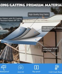 La tela del toldo está hecha de material de poliéster de tres capas de alta calidad, adecuado para diversos entornos de temperatura, proporcionando durabilidad y uso a largo plazo. Diseñado para funcionar de forma universal en autocaravanas y remolques de campistas, es fácil de instalar, brinda protección efectiva contra el clima y los rayos UV, y está disponible en una variedad de opciones de tamaño para adaptarse a diferentes necesidades.