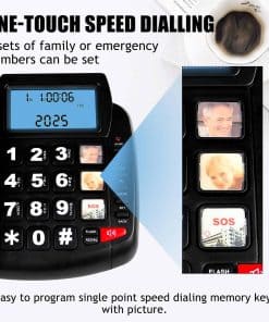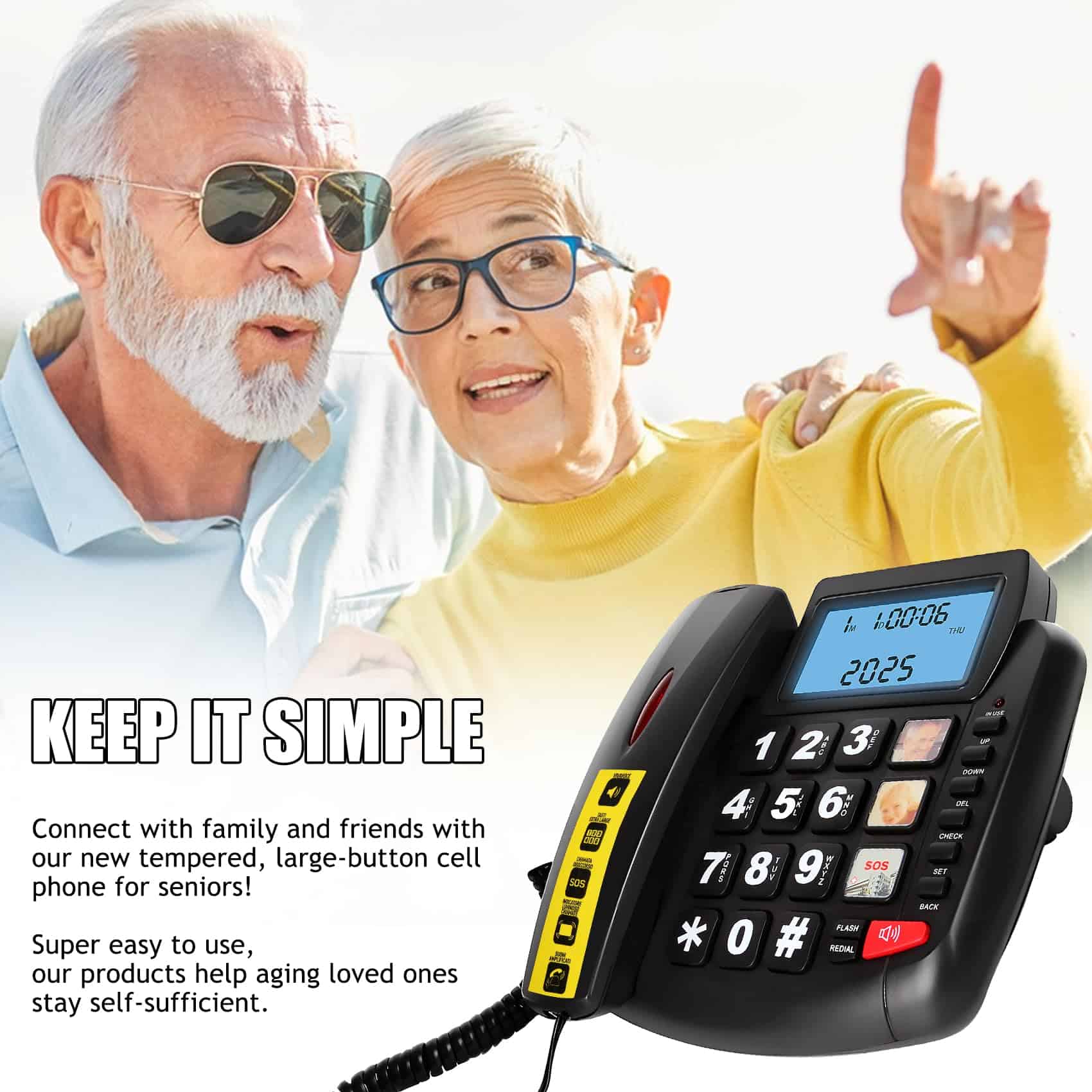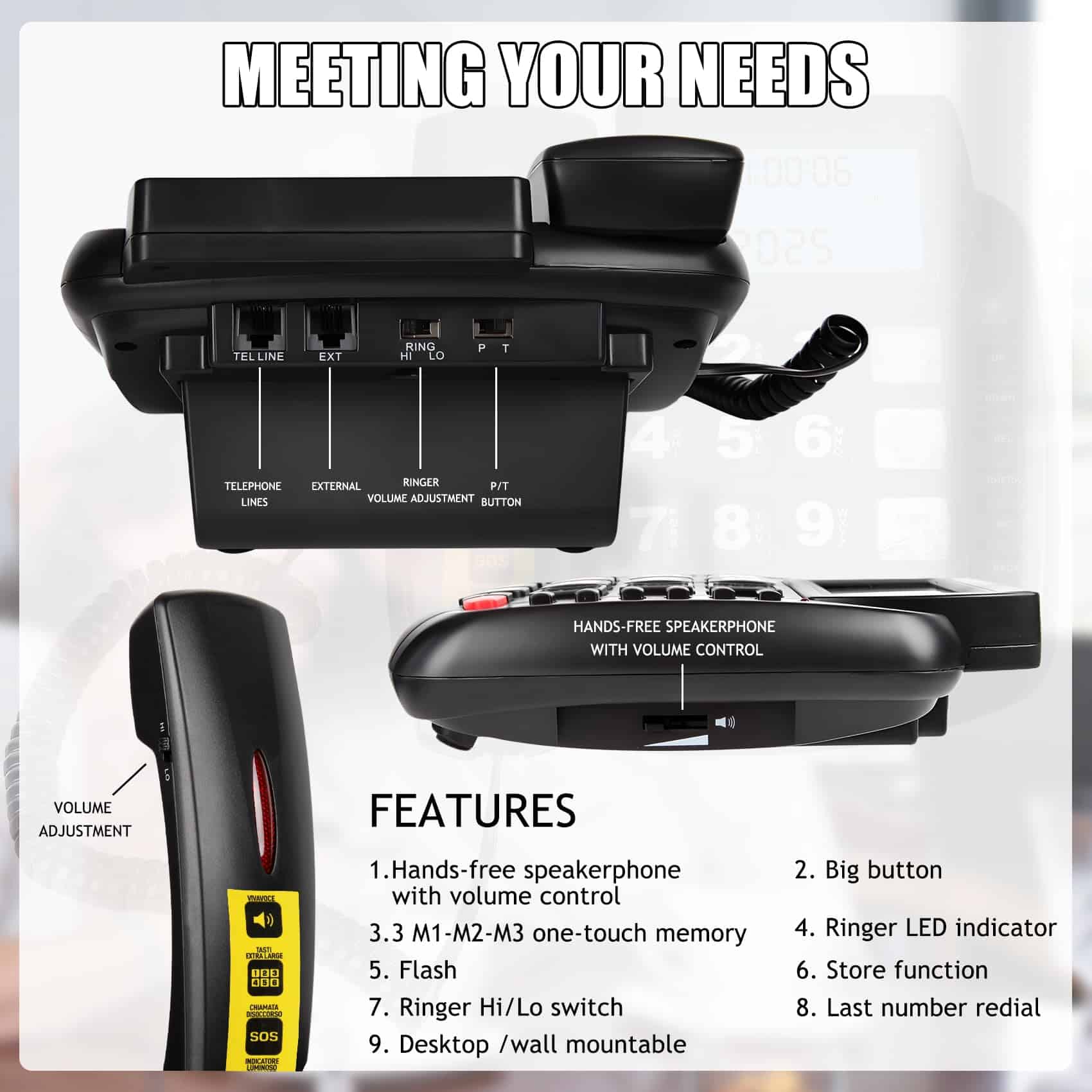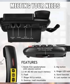 1. Marcar rápido: Nuestro teléfono de casa tiene 3 botones de marcado rápido. No es necesario ingresar el número, puede marcar directamente el contacto establecido, lo cual es adecuado para las personas mayores que no pueden recordar el número de teléfono. En caso de un accidente, puede presionar el botón de SOS para marcar una llamada de ayuda, brindando una mejor protección de seguridad a los ancianos en casa. 2. Función de teléfono manos libres: Los teléfonos de línea manos libres le permiten realizar y contestar llamadas sin sostener el auricular, liberándose de las cadenas del micrófono, para que aún pueda contestar el teléfono sin dejar su trabajo. Un clic manos libres, charle libremente, es conveniente para que varias personas participen en la conversación. 3. Botones grandes y pantalla grande: Los teléfonos con cable para el hogar tienen botones digitales grandes, fáciles de identificar, reducen las operaciones incorrectas y hacen que marcar sea cómodo y conveniente para los ancianos. Los botones de rellamada y de flash están al alcance. La pantalla LCD con pantalla retroiluminada permite ver la información claramente incluso en la penumbra o de noche. 4. Control de volumen ajustable: Los teléfonos de línea para personas mayores tienen altavoz, tono de llamada y volumen del auricular ajustables, que se pueden ajustar según las necesidades personales para ayudar mejor a las personas mayores con problemas de audición. El control de volumen le permite ajustar el volumen a su nivel preferido, asegurando que el volumen no sea demasiado bajo o demasiado alto. 5. Número para almacenamiento de protección de la batería: El nuevo teléfono de escritorio de VDTG adopta un sistema de doble alimentación. Cuando la línea telefónica se desconecta accidentalmente, la batería en el compartimento de la batería continuará suministrando energía para proteger los números de teléfono almacenados para que no se pierdan, resolviendo el problema de perder números de teléfono debido a cortes de energía inesperados.