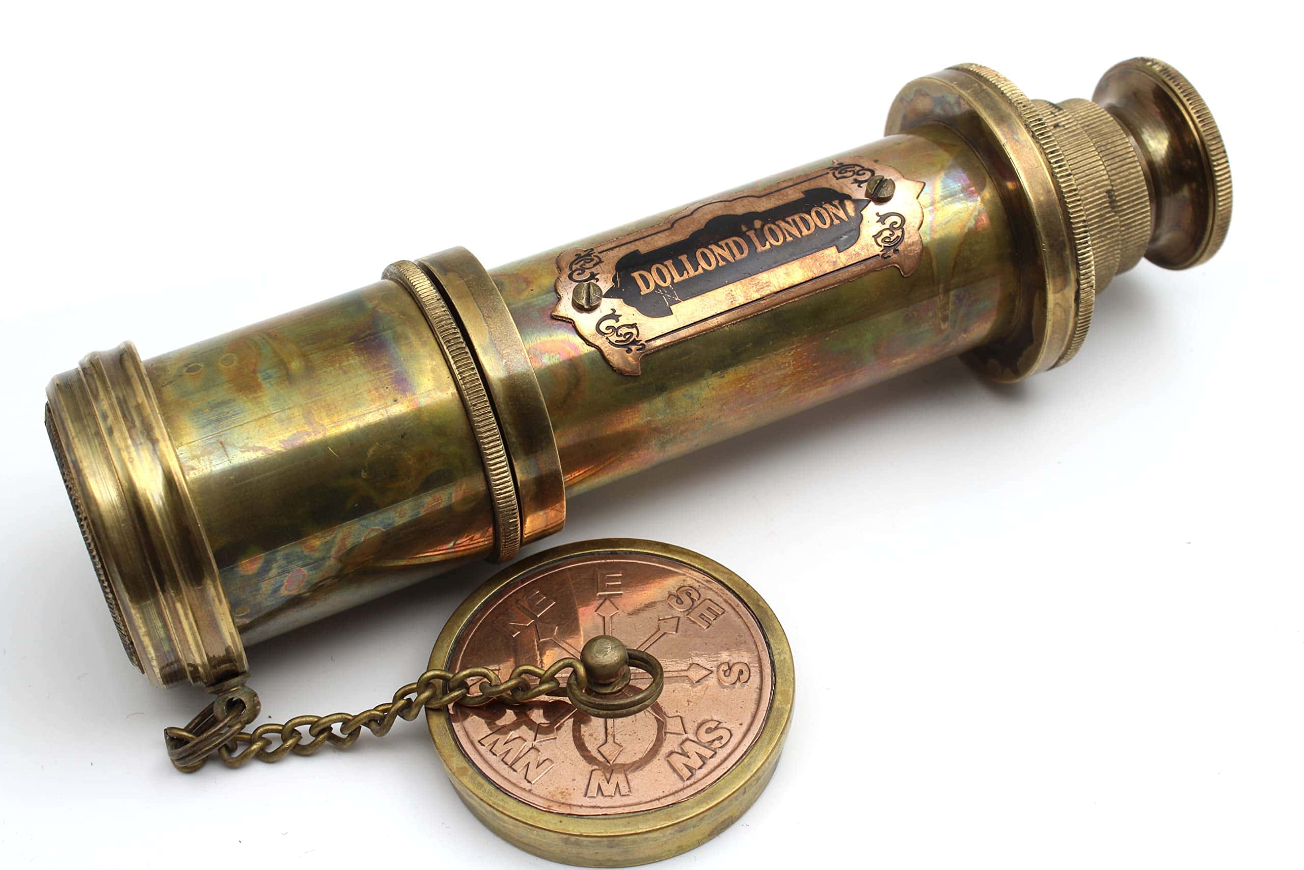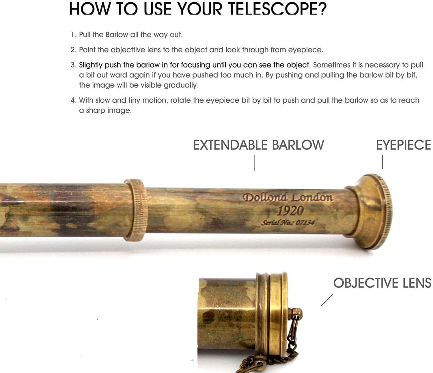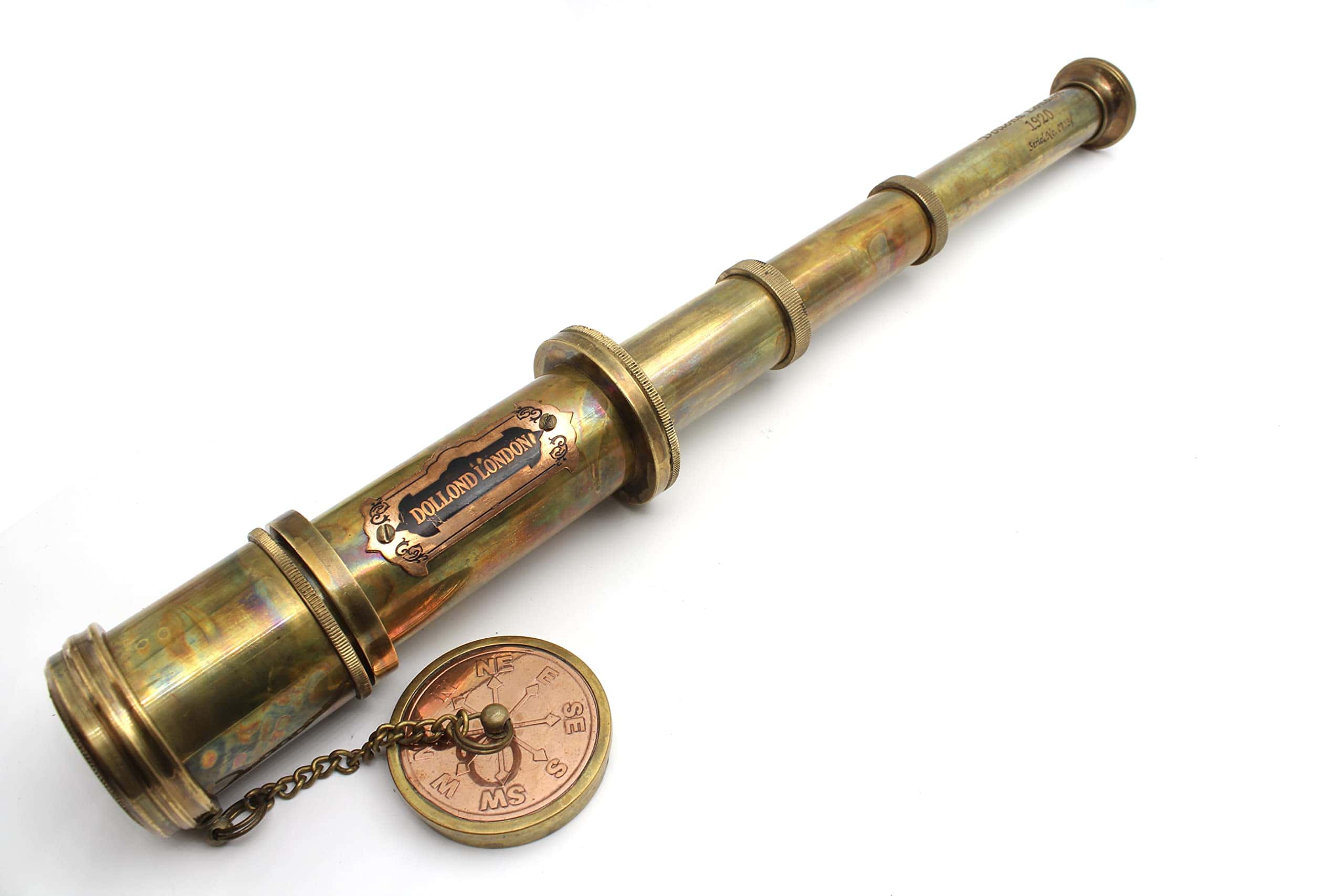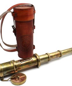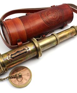 Este telescopio utiliza un mecanismo de empuje y tracción para enfocar objetos distantes. Necesitas sacarlo completamente y empujar lentamente el barril hacia adentro, mientras miras a través del telescopio, hasta que el objeto deseado se vuelva claro. El telescopio está hecho de latón y cuero; Dimensiones: 4.5 x 4.5 x 45cm (1.77 x 1.77 x 17.71 pulgadas); Peso: 0.530 kg (1.17 libras). Este telescopio de mano es una opción de regalo única para viajeros, coleccionistas náuticos y un regalo educativo para niños en ocasiones como cumpleaños, ceremonia de promoción, Acción de Gracias, Navidad, día de la amistad, Pascua, compromisos, bodas, aniversarios y más. Este telescopio pirata se puede utilizar durante años como un elemento decorativo en su hogar y lugar de trabajo. Mejora la decoración de su hogar dándole un toque elegante y sofisticado. Ideal para usar en botes, excursiones de senderismo, observación de aves, eventos deportivos, viajes al aire libre, turismo, conciertos, juegos de pelota, juegos de rol, viajes, etc. Este Telescopio de Bolsillo Marino Con caja es ideal para cualquier número de actividades al aire libre como Caza, Tiro, Observación de Aves o Juegos de Rol. Este espía tiene una óptica excelente para una visualización real y sería una maravillosa decoración náutica utilizable en cualquier oficina, barco o hogar o para regalar a sus seres queridos.