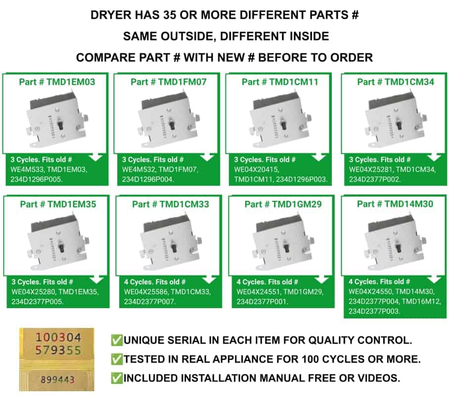 GLOB PRO SOLUTIONS TMD1EM03 TMD1FM07 234D1296P004 DM101 CKD2116 Temporizador de Secadora Control 6 Terminales de Reemplazo para y compatible con el Pesado Deber de la marca registrada Glob Pro Solutions en proceso. Consulte las opciones categorizadas por medidas o conectores, este producto tiene diferentes números de partes. Si necesita algo más rápido, vea otras opciones en el proceso de compra, la parte tiene 20 números diferentes de partes como: TMD1EM03 TMD1FM07 234D1296P004 DM101 si tiene el número de serie antiguo, la nueva parte tiene un nuevo número y se ve diferente a su parte antigua pero la nueva parte se ajusta perfectamente a los números de serie antiguos y nuevos GTDP180ED1WW-GEH, GTDP180ED2WW-GEH, GTDP180ED3WW-GEH, GTDP180ED4WW-GEH, GTDP180ED5WW-GEH, GTDP200EF0WS-GEH, GTDP200EF1WS-GEH, GTDP200EF2WS-GEH, GTDP200EF3WS-GEH, GTDP200EF4WS-GEH, GTDP200EF5WS-GEH, GTDP200EM0WW-GEH, GTDP200EM1WW-GEH, GTDP220EF0WW-GEH y más. Esta parte se ajusta perfectamente, no necesita cables adicionales, terminales o pegamento, trabajo fácil en un promedio de 15 minutos, parte de repuesto Universal NON OEM con estándares OEM, reemplazo para y compatible con True, Beverage Air, Plased, Tecumseh, RCA, Estate Whirlpool, Monogram, Maytag GE Kenmore Samsung, Frigidaire, Amana, LG Miele y más. Esas marcas solo se utilizan como ilustración, Modelos