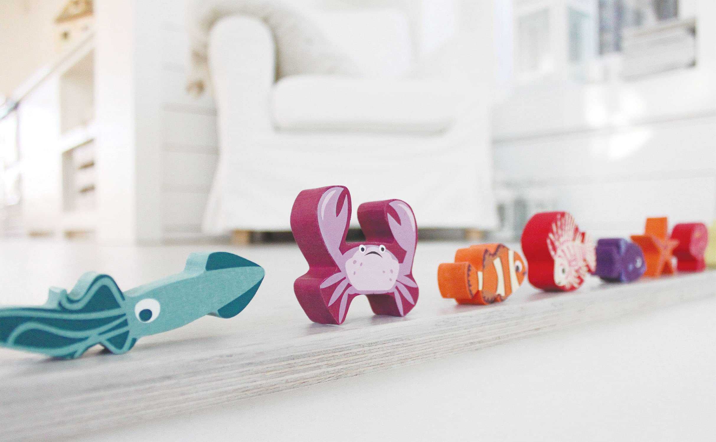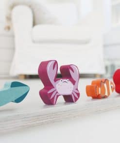 Un apilador de madera bajo el mar con 18 criaturas marinas maravillosamente coloreadas que incluyen un camarón, un calamar, un cangrejo, 2 anguilas, un erizo de mar, una anémona de mar, una estrella de mar, un caballito de mar, 4 peces, cuatro piezas de coral y un cangrejo ermitaño. Rango de edad: 18 meses + Tamaño del producto: 10.63 x 3.15 x 9.84″ Peso: 1.25 lbs