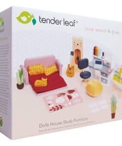 Cree un espacio de estudio acogedor y productivo en su casa de muñecas con nuestro set de Muebles de Estudio de Casa de Muñecas. Este set incluye una elegante silla giratoria de oficina, un escritorio funcional, una computadora portátil, una lámpara Anglepoise, libros, un sofá extensible con cojines, una guitarra, un gato, un caballete de madera, una planta en maceta, una alfombra impresa y un dulce reloj de oso. Es la adición perfecta para inspirar la creatividad y el aprendizaje de tu muñeca.