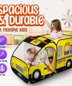 ¡Hecho para ser resistente y compacto para viajar, esta tienda de juguete con ruedas de autobús es ideal para el próximo campamento y pijamadas al aire libre de tu familia! Con sus bordes de doble costura, diseño plegable y duraderos postes y conectores incorporados, esta tienda de juegos para niños se puede transportar y quitar de un lugar a otro según sea necesario.