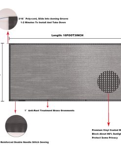 1. Bloqueo UV & Vista abierta – Utilizado como toldo delantero para RV, bloquea aproximadamente el 86% de los rayos UV para proteger nuestra piel y ojos. Al mismo tiempo, ofrece una vista amplia. 2. TEMPERATURA MÁS BAJA – te proporciona un lugar sombreado amplio y acogedor. Disfruta de tu tiempo cómodamente incluso en días extremadamente calurosos. 3. REDUCE EL VIENTO EFICIENTEMENTE – especialmente rompe la fuerza del viento cruzado. Obtienes un campo más acogedor al usarlo con nuestro toldo lateral. 4. FÁCIL INSTALACIÓN Y DESMONTAJE – ligero y cómodo de usar. 4 juegos de estacas de plástico y bolas elásticas incluidas en bolsa de almacenamiento. 5. CÓMO ORDENAR – La medida real del tejido terminado de 8’X16’3» es de 8 pies de ancho y 16 pies 3 pulgadas de largo, es adecuado para un toldo de 17 pies de RV (La medida de Centro de brazo a Centro de brazo del toldo de RV), y se adapta a la mayoría de las marcas de toldos como Dometic (A&E), Carefree, Lippert, Fiamma, Solera, etc.