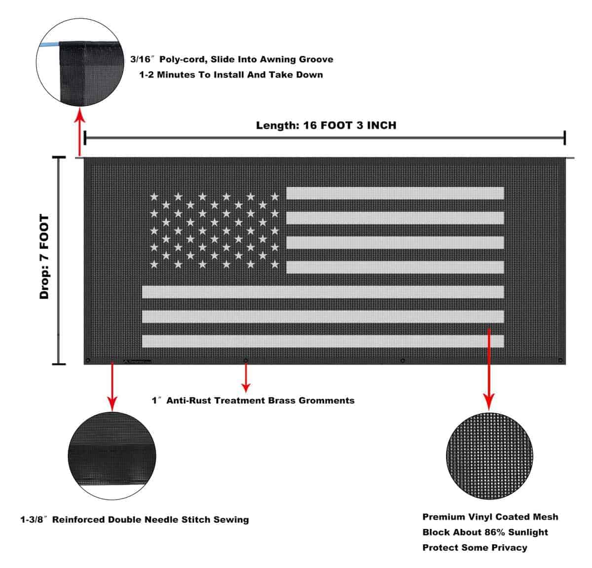 1. Toldo de sombra personalizado con bandera de EE. UU. para el toldo de RV con BLOQUEO UV y VISTA ABIERTA utilizado como toldo frontal de RV, bloquea aproximadamente el 86% de los rayos UV para proteger nuestra piel y ojos. Al mismo tiempo, ofrece una amplia vista. Imagen personalizada disponible.