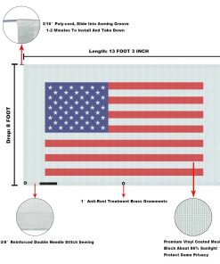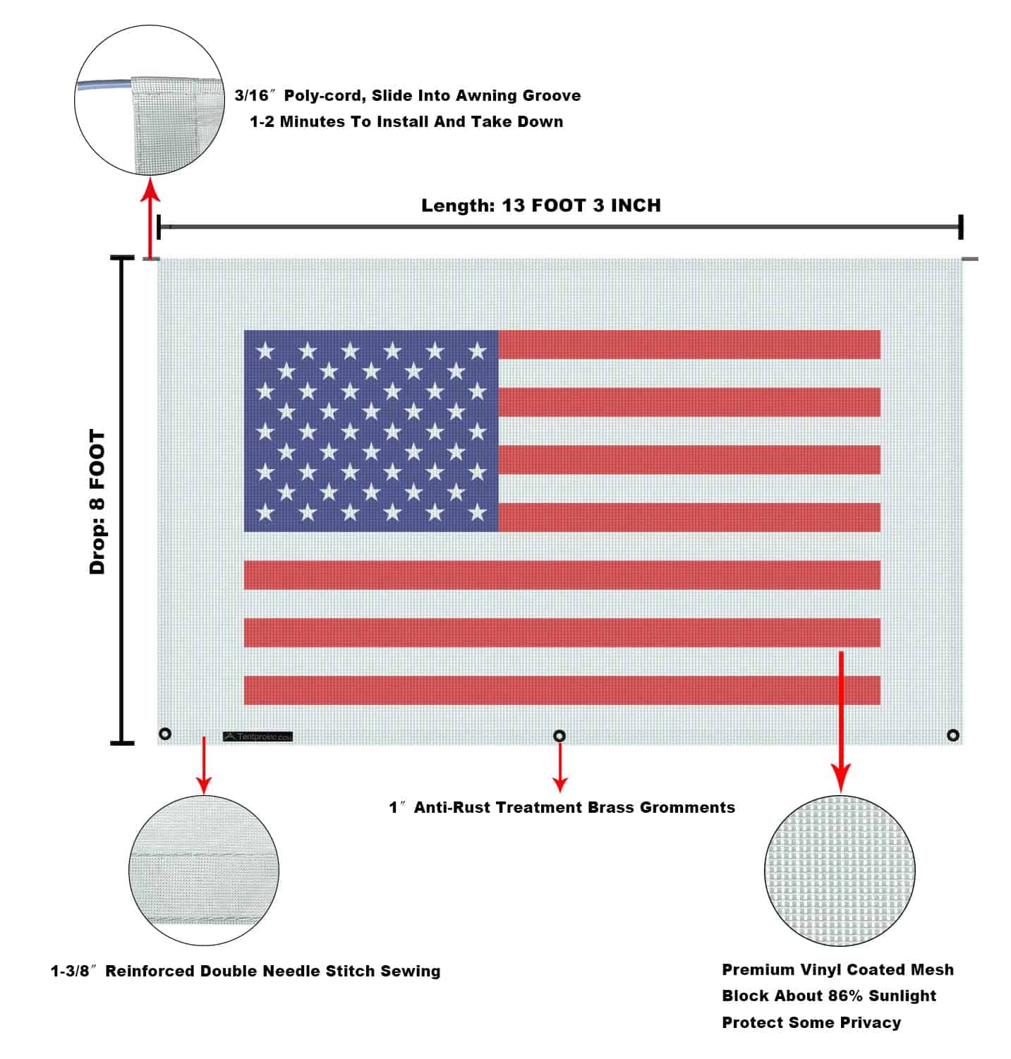1. Toldo de sombra con diseño personalizado de Bandera de EE. UU. con BLOQUEO UV y VISTA ABIERTA Utilizado como toldo frontal de RV, bloquea aproximadamente el 86% de los rayos UV para proteger nuestra piel y ojos. Al mismo tiempo, ofrece una amplia vista. Imagen personalizada disponible. 2. TEMPERATURA MÁS BAJA: te proporciona un lugar amplio y acogedor con sombra. Disfruta cómodamente de tu tiempo incluso en días extremadamente calurosos. 3. REDUCE EL VIENTO EFICIENTEMENTE: rompe especialmente la fuerza del viento cruzado. Obtienes un campo más acogedor cuando lo usas con nuestra pantalla lateral. 4. FÁCIL INSTALACIÓN Y DESMONTAJE: ligero y cómodo al tacto. Desliza el cordón de poliéster incluido en la barra de enrollar en minutos, se incluyen 3 juegos de estacas de plástico y bolas elásticas en la bolsa de almacenamiento. 5. CÓMO PEDIR: La medición real del tejido terminado de 8’X13’3» es de 8 pies de caída por 13 pies 3 pulgadas de longitud, es adecuado para toldos de RV de 14 pies (La medida de centro de brazo a centro de brazo del toldo de RV), y se adapta a la mayoría de las marcas de toldos como Dometic (A&E), Carefree, Lippert, Fiamma, Solera, etc. No es adecuado para toldos de RV Girard.