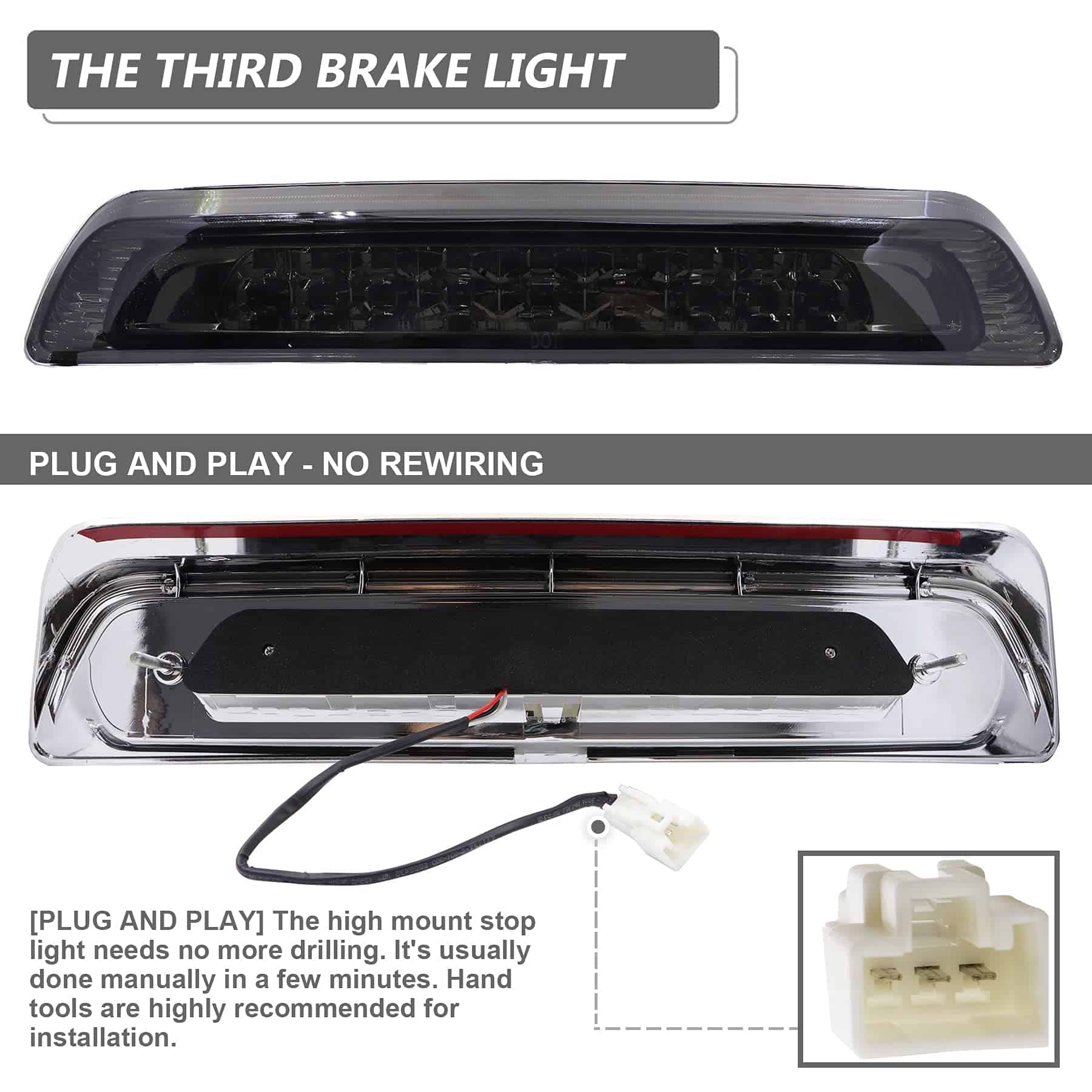 La Tercera Luz de Freno LED con lente ahumada es el accesorio perfecto para tu Toyota Tundra 2007-2018. Este producto está diseñado para ofrecer una luz de freno más brillante y visible para alertar a otros conductores, garantizando así tu seguridad en la carretera. El material duradero de policarbonato de la lente garantiza una protección UV superior, resistencia a impactos y funciona de manera óptima en cualquier condición climática adversa. Con una clasificación IP67 a prueba de agua, esta luz de freno del Tundra está construida para durar y funcionar de manera confiable. La instalación es sencilla gracias al diseño plug and play, no se requiere perforar y se recomienda utilizar los tornillos de fábrica para un mejor ajuste. Además, se incluye una garantía de 1 año y un servicio al cliente amigable disponible las 24 horas. ¡Agrega un toque de estilo y seguridad a tu vehículo con esta tercera luz de freno LED con lente ahumada para Toyota Tundra!
