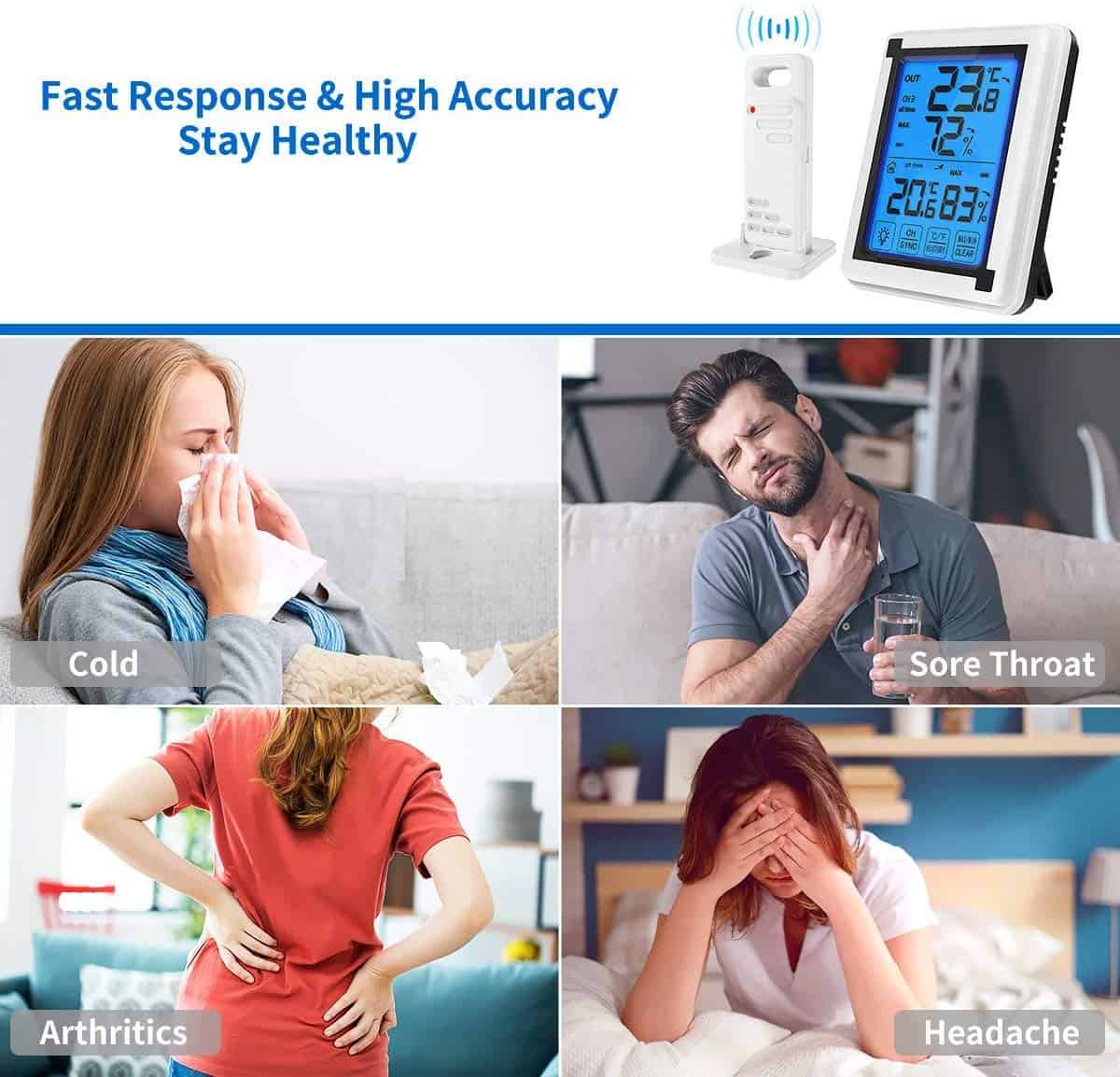 Este termómetro higrómetro interior exterior es una estación meteorológica perfecta que te permite conocer la temperatura y la humedad precisas alrededor de tu hogar. Ideal para estudio, lugares públicos, oficinas, etc. Instrucciones: selecciona el canal y sincroniza para mostrar las lecturas de temperatura y humedad de hasta 3 sensores remotos. Presiona y mantén presionado para re-sincronizar o volver a emparejar la unidad. Especificaciones: 1. 4 botones funcionales: luz de fondo, CH/SYNC, C/ F/historial, Max/Min/Limpiar. 2. Rango de temperatura interior: -20°C a 70°C. 3. Rango de temperatura exterior: -40°C a 70°C. 4. Resolución de temperatura: 0.1°C/ F. 5. Rango de humedad: 20%-95%; Resolución de humedad: 1%. 6. Unidad de visualización de temperatura: C/ F seleccionable. 7. Alcance inalámbrico: 60m dependiendo de los materiales de construcción. 8. Frecuencia inalámbrica: 433 MHz. 9. Alimentación: Display: 2 x pilas AAA 1.5V; Sensor: 2 x pilas AAA 1.5V. (baterías no incluidas). Nota: El sensor exterior comienza a leer el valor exacto y transmitir la señal después de 30 minutos. Contenido del paquete: 1 x Termómetro Higrómetro Monitor de Humedad, 1 x Sensor Exterior, 1 x Manual de instrucciones.