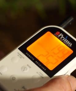 Termómetro Digital Remoto para BBQ de Primo – PG00339. PG00339. Termómetros para parrilla. El Termómetro Digital Primo te ayudará a asegurar que tu comida y parrilla estén siempre a la temperatura adecuada. Con una base y un receptor inalámbrico, esta unidad proporciona lecturas precisas de temperatura de hasta 300 pies de distancia. Colocando un cable de sonda resistente al calor dentro de tu Parrilla Primo y la otra sonda en la carne, puedes monitorear la temperatura de la cúpula y la temperatura interna de la carne. El receptor inalámbrico con pantalla LCD emite pitidos y destellos cuando la carne o la temperatura exceden tu temperatura programada. Este Termómetro Primo también cuenta con un temporizador de cuenta atrás y cuenta arriba y una luz de fondo para uso nocturno. El receptor tiene un clip para el cinturón y un soporte incorporado para mantener un ojo en tu comida. El transmisor tiene un soporte de cable removible que también se convierte en un gancho que se puede utilizar con tu parrilla. Un cable especial de sonda para cámara de humo viene con un clip para adjuntar al estante de la parrilla. (4 pilas AAA incluidas).