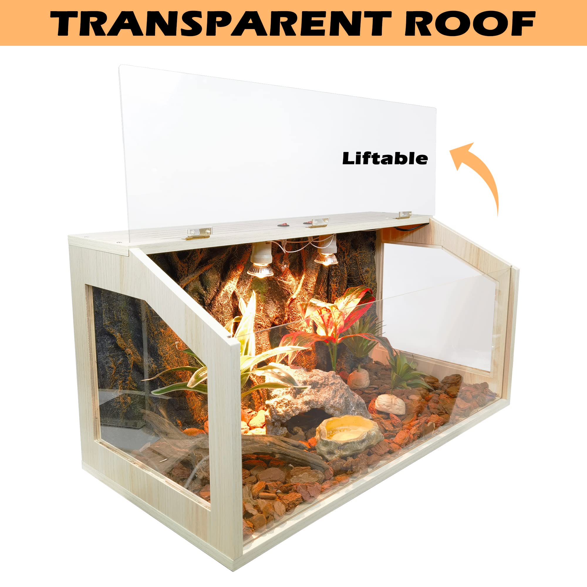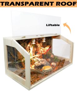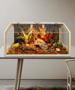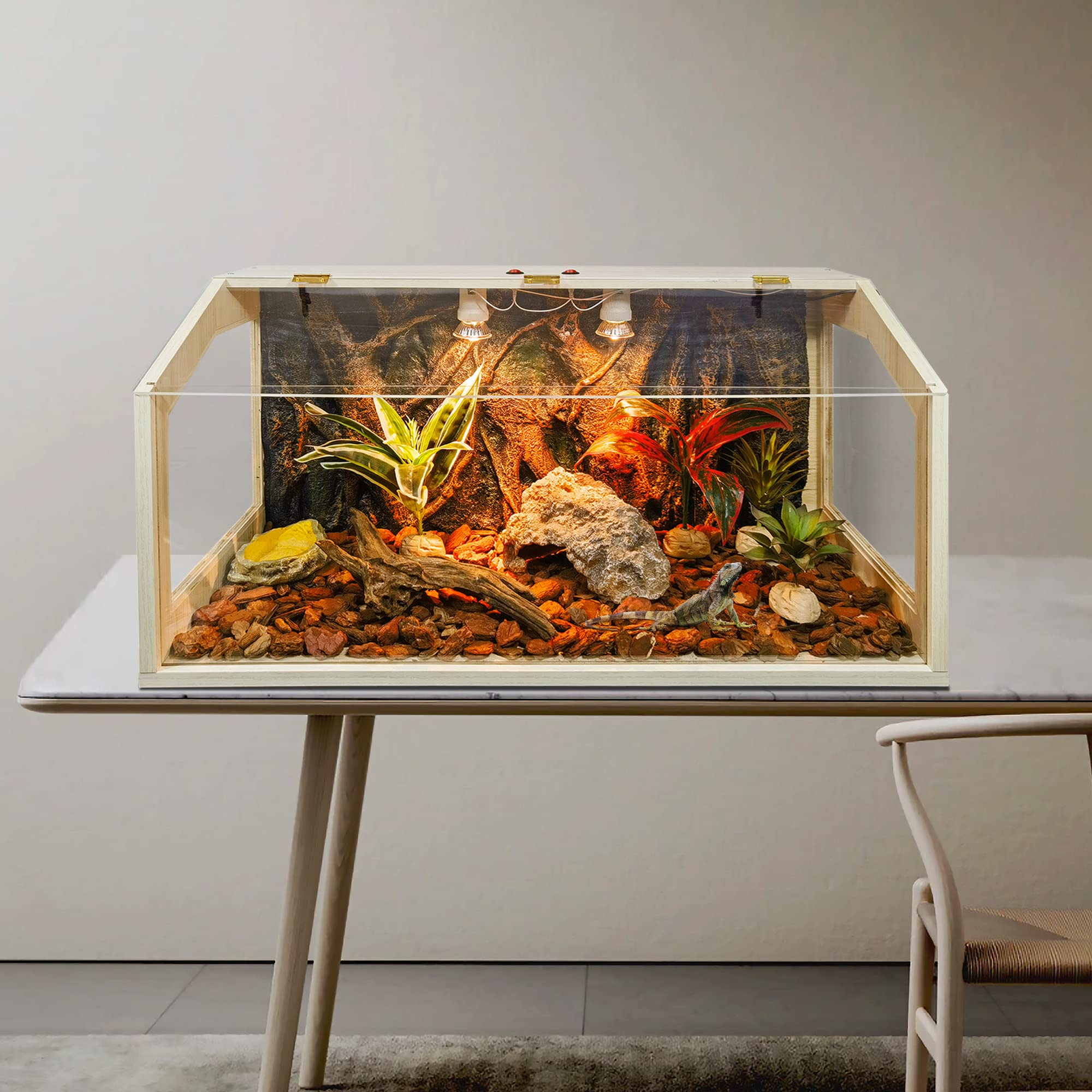 Habitat Premium para Reptiles Nuestro terrario para reptiles es la elección perfecta para los entusiastas de los reptiles. El interior de nuestro hábitat proporciona suficiente espacio para que sus reptiles exploren y se muevan libremente. El panel acrílico frontal proporciona transparencia, ofreciendo una vista despejada de sus reptiles. Hay salidas de aire en la parte superior y lateral, garantizando suficiente circulación de aire para sus reptiles. ¡Advertencia: Este Terrario No Puede Almacenar Agua! Está disponible en 4 tamaños diferentes. Hemos utilizado solo los mejores materiales de madera y acrílico amigables para mascotas y humanos para este hábitat. Construido con madera natural fuerte de alta densidad con un recubrimiento resistente a la corrosión y al agua, garantiza longevidad pero también agrega un toque de elegancia con sus hermosos patrones de grano de madera. El fondo está equipado con un panel acrílico impermeable, para proteger sus terrarios de accidentes relacionados con la orina o el agua. Nuestro terrario está equipado con dos zócalos preinstalados (la versión de 40/48 pulgadas tiene 3) y interruptores compatible con bombillas de calor E27, luces nocturnas, luces y más (bombillas no incluidas). Simplemente instale las luces y estará listo para ser un hábitat perfecto para sus reptiles.
