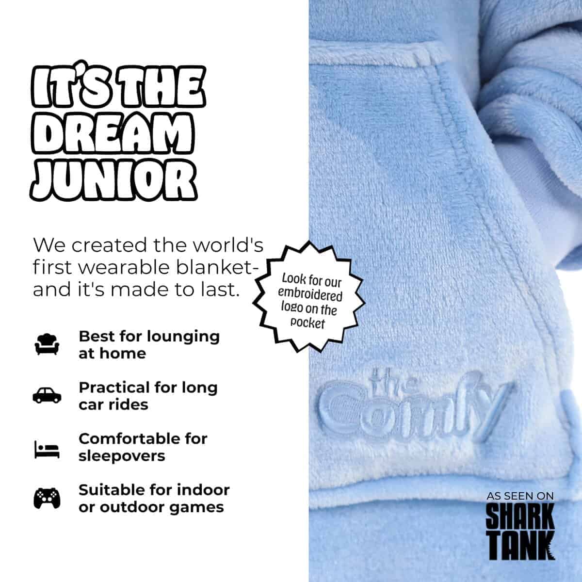 1. La manta portátil original como se ve en Shark Tank: Este producto está protegido, lo que verifica la autenticidad de cada unidad. ¡Cuando compras The Comfy, estás obteniendo la manta portátil patentada que hizo que las mantas portátiles fueran una tendencia! Inventado por dos hermanos que presentaron el concepto a Shark Tank de la ABC y recibieron respaldo de Barbara Corcoran.