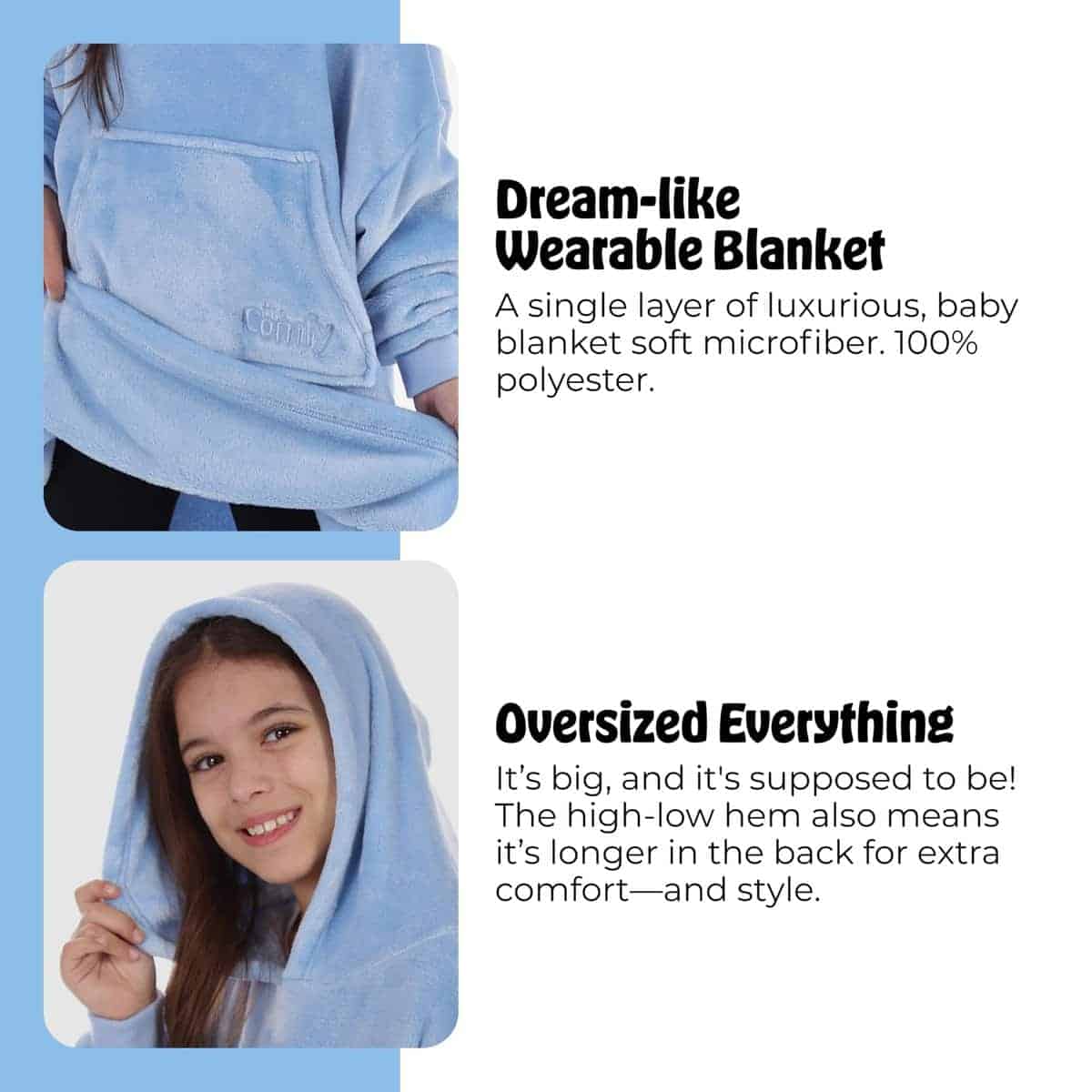2. Divertido y funcional: Somos la marca que lanzó una locura mundial y hizo que usar tu manta fuera algo. La manta portátil Comfy DreamTM es una sola capa de lujosa microfibra tan suave que te sentirás como si estuvieras usando una manta de bebé. Su sensación de seda y ligereza la hace perfecta para usar en casa, o incluso para llevar contigo cuando necesitas tu calor para viajar. ¡Llévala al próximo barbacoa al aire libre, viaje de campamento, playa, autocine, pijamada o úsala en la escuela!