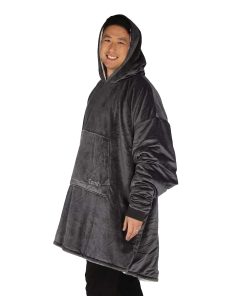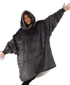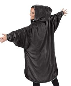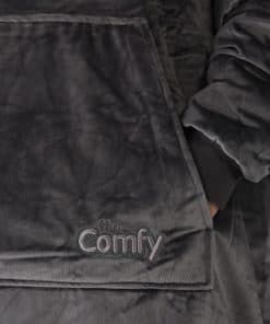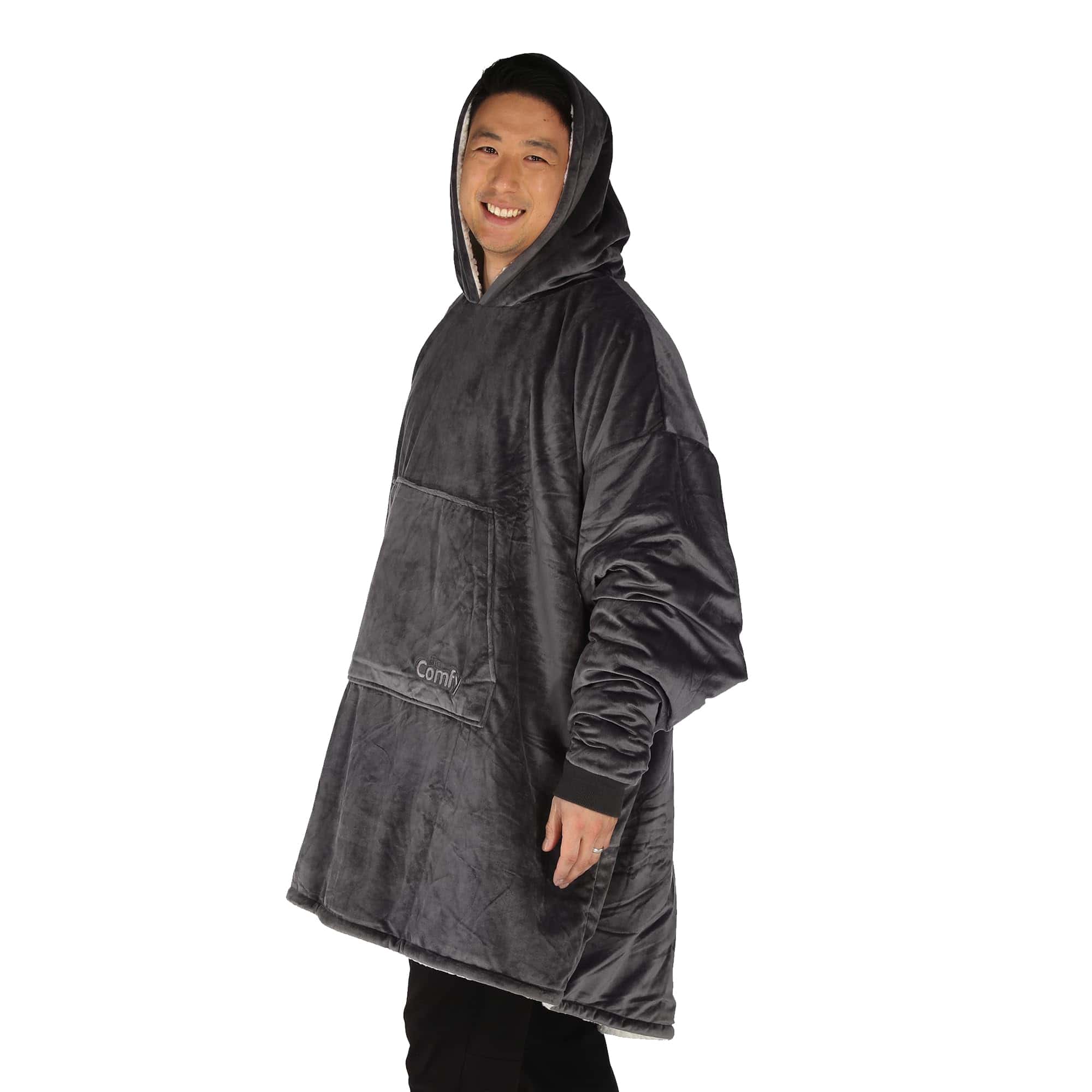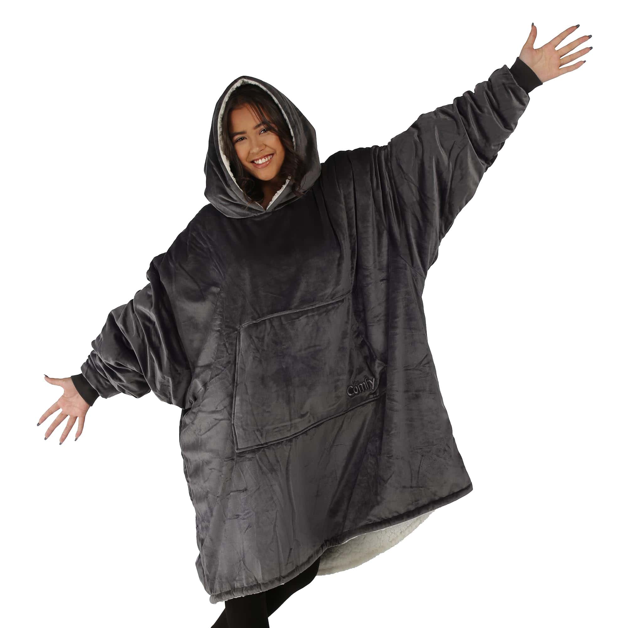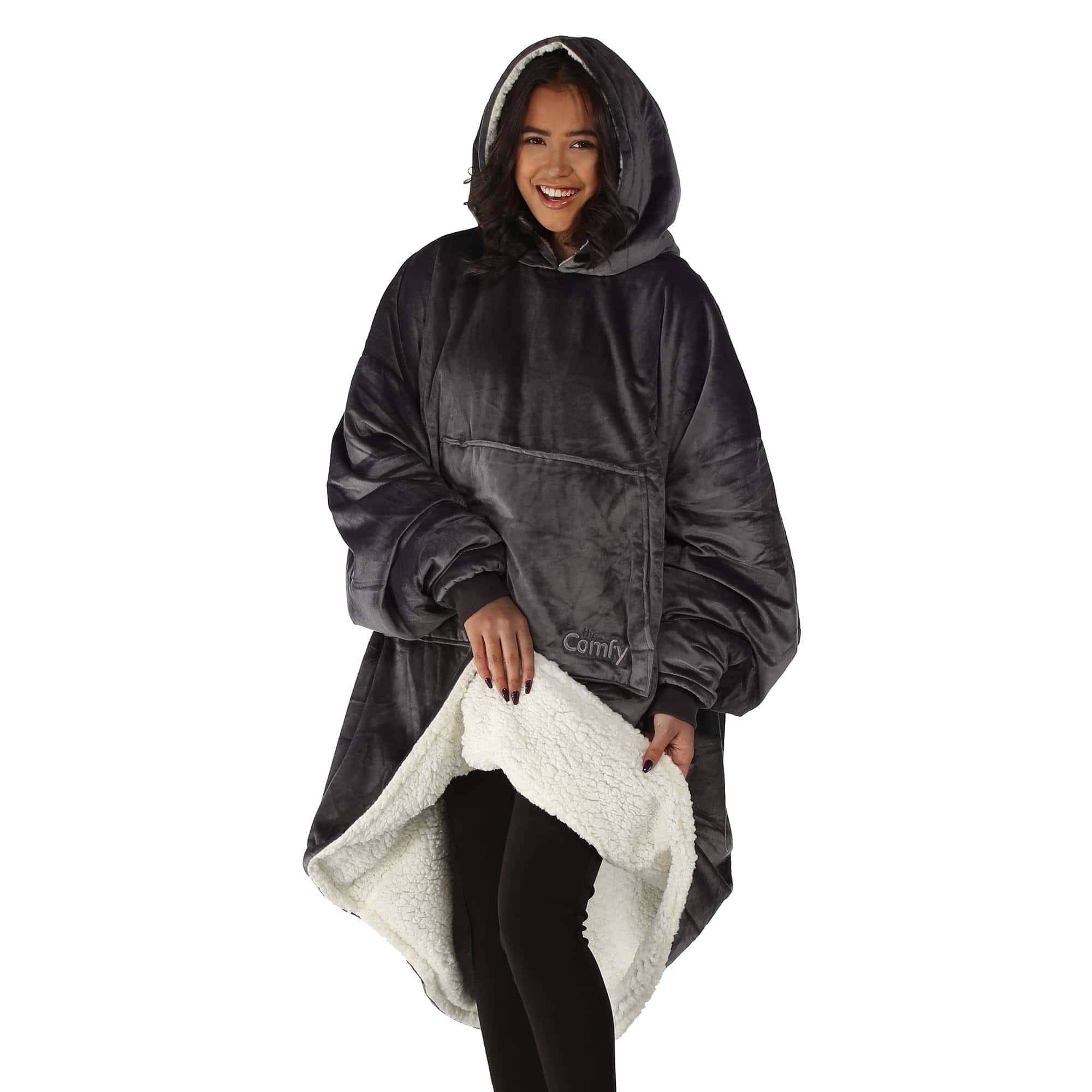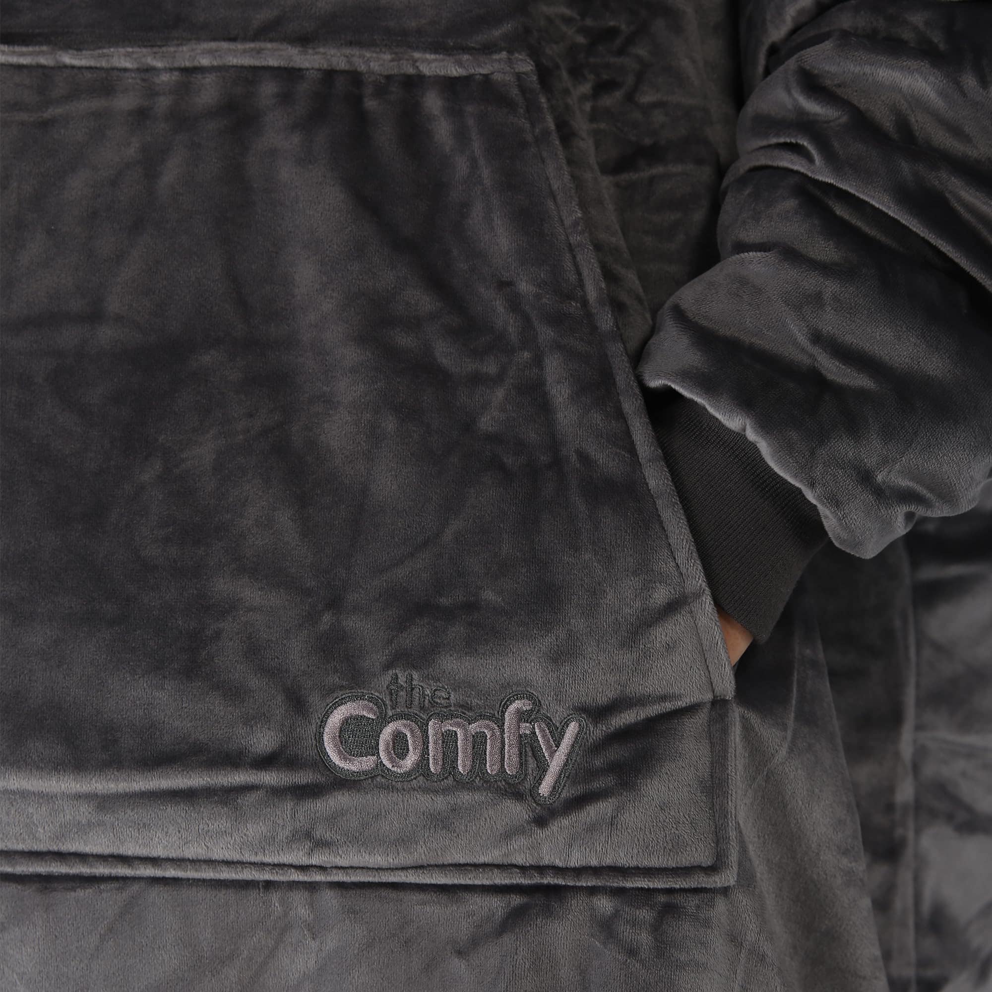 4. Todo en tamaño extragrande: ¡Es gigante y así lo queremos! Comenzamos con una talla 5XL de hombre y solo hemos ido a más. ¡Con una gran capucha esponjosa, un bolsillo marsupialTM, mangas extragrandes y un dobladillo alto-bajo, The Comfy es como ser abrazado por una nube! Mete tus piernas, levanta la capucha o camina libremente mientras llevas el calor de tu manta a donde vayas. ¡Ahora puedes llevar tu manta realmente a cualquier lugar!