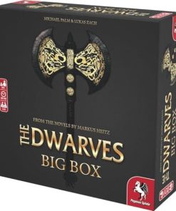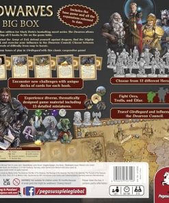 Los Enanos enfrentan la oscura amenaza de Orcos, Trolls y lfar. Para vencer al mal, deben unir fuerzas y coordinar sus acciones. Basado en la serie de novelas de Markus Heitz, el juego cooperativo para 2 a 6 jugadores de 10 años en adelante, los sumerge en varios escenarios, en los que deben gastar sabiamente sus puntos de acción en cada turno, para recolectar equipo, cumplir misiones, usar sus habilidades especiales, viajar por el país y luchar contra la amenaza que avanza antes que su tierra sucumba a la oscuridad. The Dwarves Big Box combina el galardonado juego base del 2012, la gran expansión Saga, la Nueva Expansión de Héroes, las expansiones de historia Combined Might y The Triumph of the Dwarves, así como la expansión de lfar en un atractivo paquete, altamente jugable. Contenido: 2 Tableros de juego, 212 Cartas, 15 Miniaturas, 12 Tableros de personajes, 75 Tropas, 104 Fichas, 15 Marcadores de escenario, 7 Dados de número, 3 Dados de reclutamiento, 6 Marcadores de salud, 1 Libro de reglas