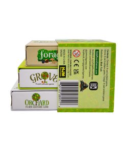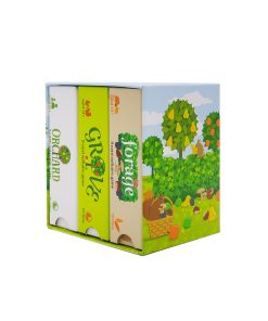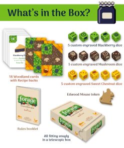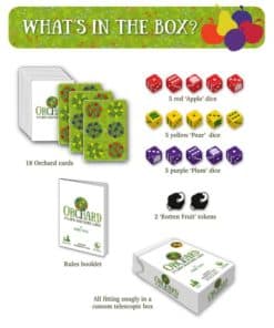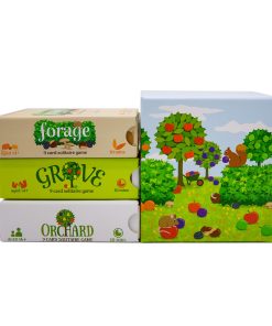 La Trilogía de la Cosecha es una colección de juegos de solitario de colocación de fichas rápidos y brillantemente diseñados por Mark Tuck que se juegan en menos de 10 minutos. Cada uno ofrece puntuaciones y desafíos únicos: En Orchard, el objetivo es cosechar frutas (sumar puntos) jugando cartas de manera que los árboles frutales se superpongan con otros árboles que ya estén en el huerto y que den la misma fruta. Cuantos más árboles puedas superponer, más frutas recogerás. Además de las nueve cartas de doble cara, tus 15 dados (de tres colores) llevan el registro de tu cosecha creciente. Tus dos fichas de fruta podrida te permiten jugar una carta que de otro modo no podrías pero con una penalización de puntos, por lo que debes decidir cuándo y si jugarlas. En Grove, sus 18 cartas presentan árboles de naranja, limón y lima y un nuevo elemento de ‘comodín’, los espacios abiertos sin árboles, llamados claros. Estos espacios combinados con un nuevo mecanismo de puntuación ofrecen más formas y oportunidades para aumentar tu cosecha y crear una mayor variedad de juego y estrategias en comparación con Orchard. También encontrarás una ardilla traviesa, que puede ayudar u obstaculizar tu recogida de frutas, así como una carretilla útil si logras obtener una cosecha extra grande. En cuanto a Forage, sus 18 cartas muestran diferentes tipos de áreas boscosas, donde encontrarás moras silvestres, castañas dulces y setas comestibles. Algunas áreas están divididas en dos tipos que, junto con los dados personalizados que presentan ratones de madera hambrientos, ofrecen nuevas oportunidades y estrategias diferentes para aumentar tu cosecha. Los reversos de las cartas tienen desafíos de recetas para proporcionar una condición de ganar/perder (como una alternativa a la modalidad habitual del juego de ‘supera tu propia puntuación’) para aquellos que lo prefieran, añadiendo aún más rejugabilidad.