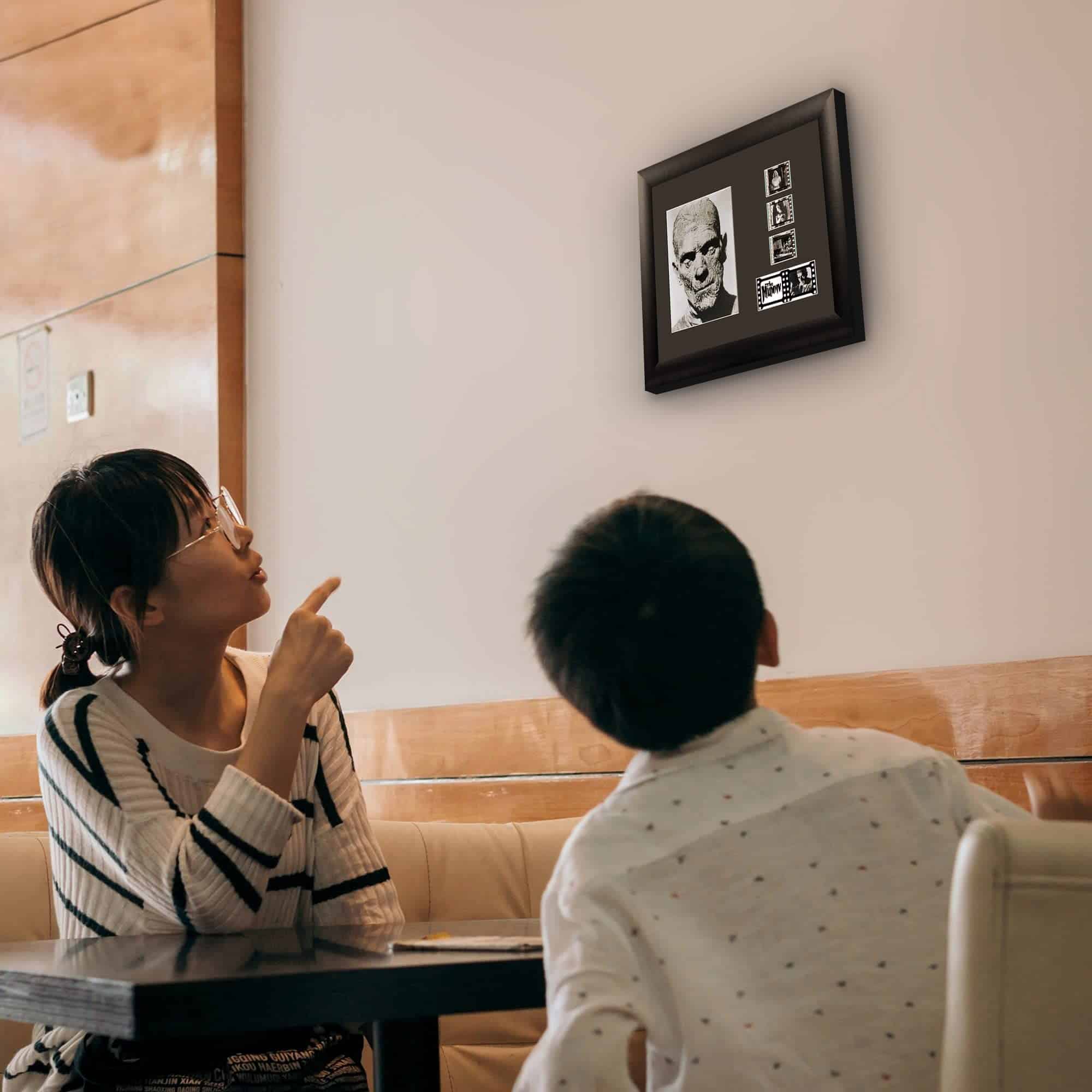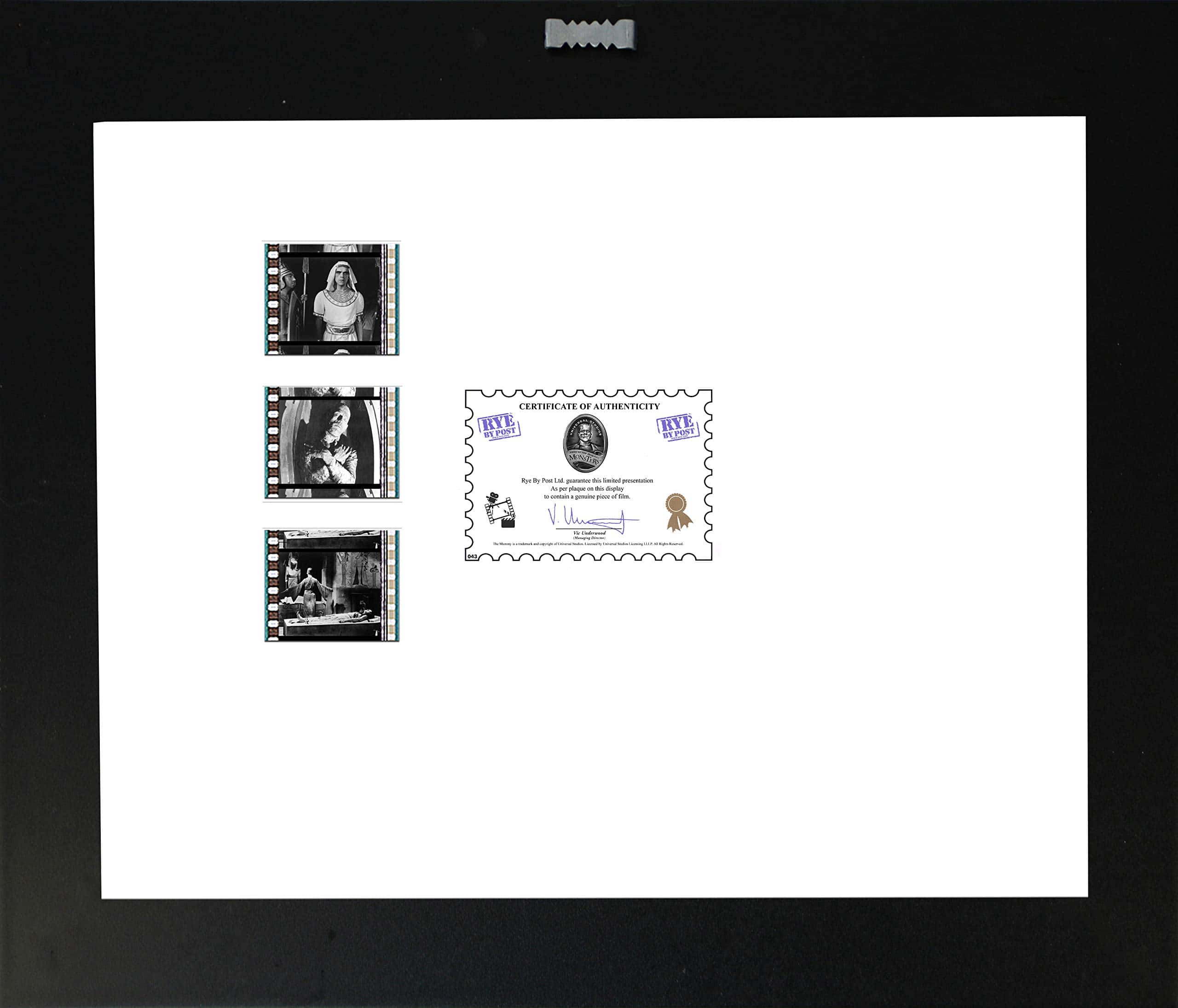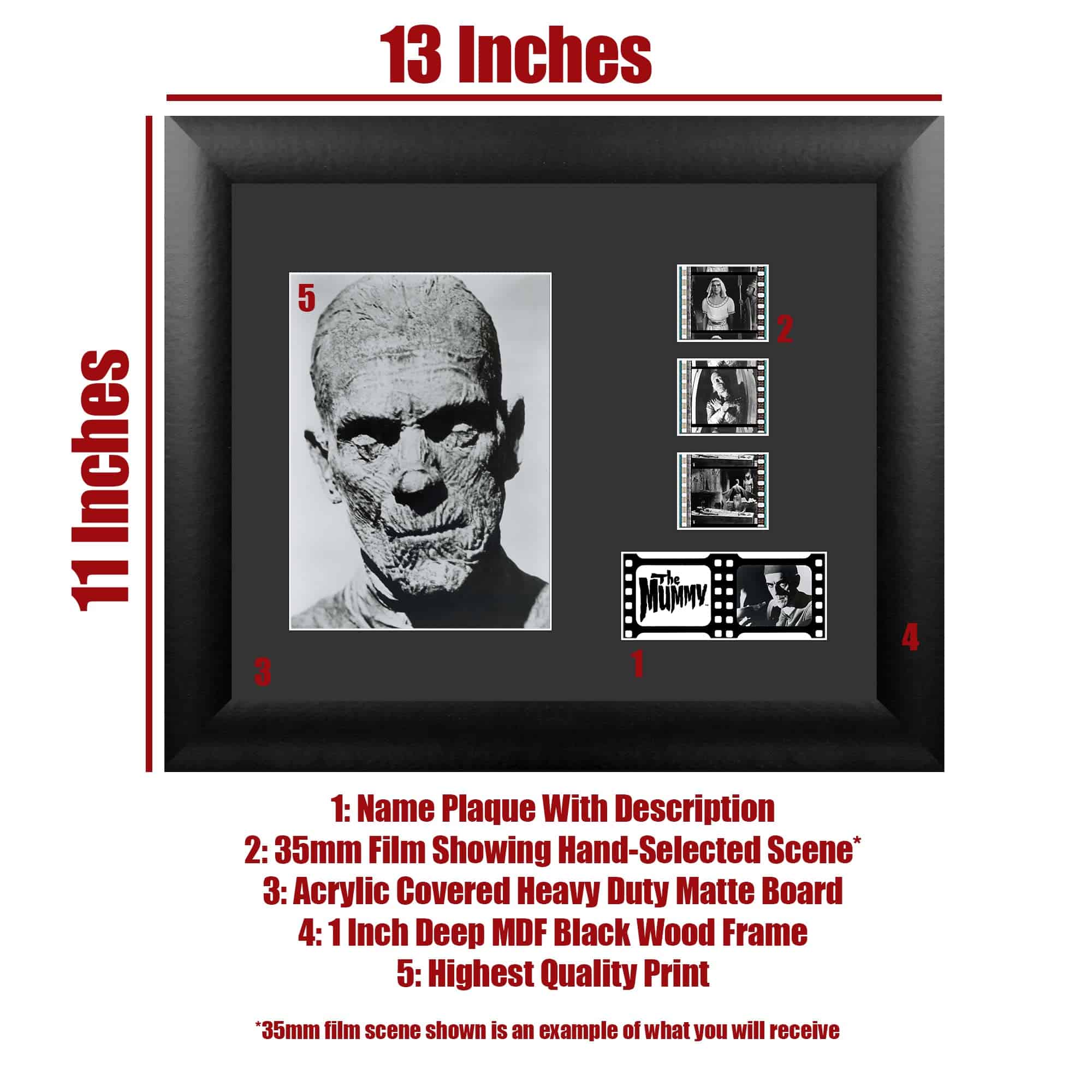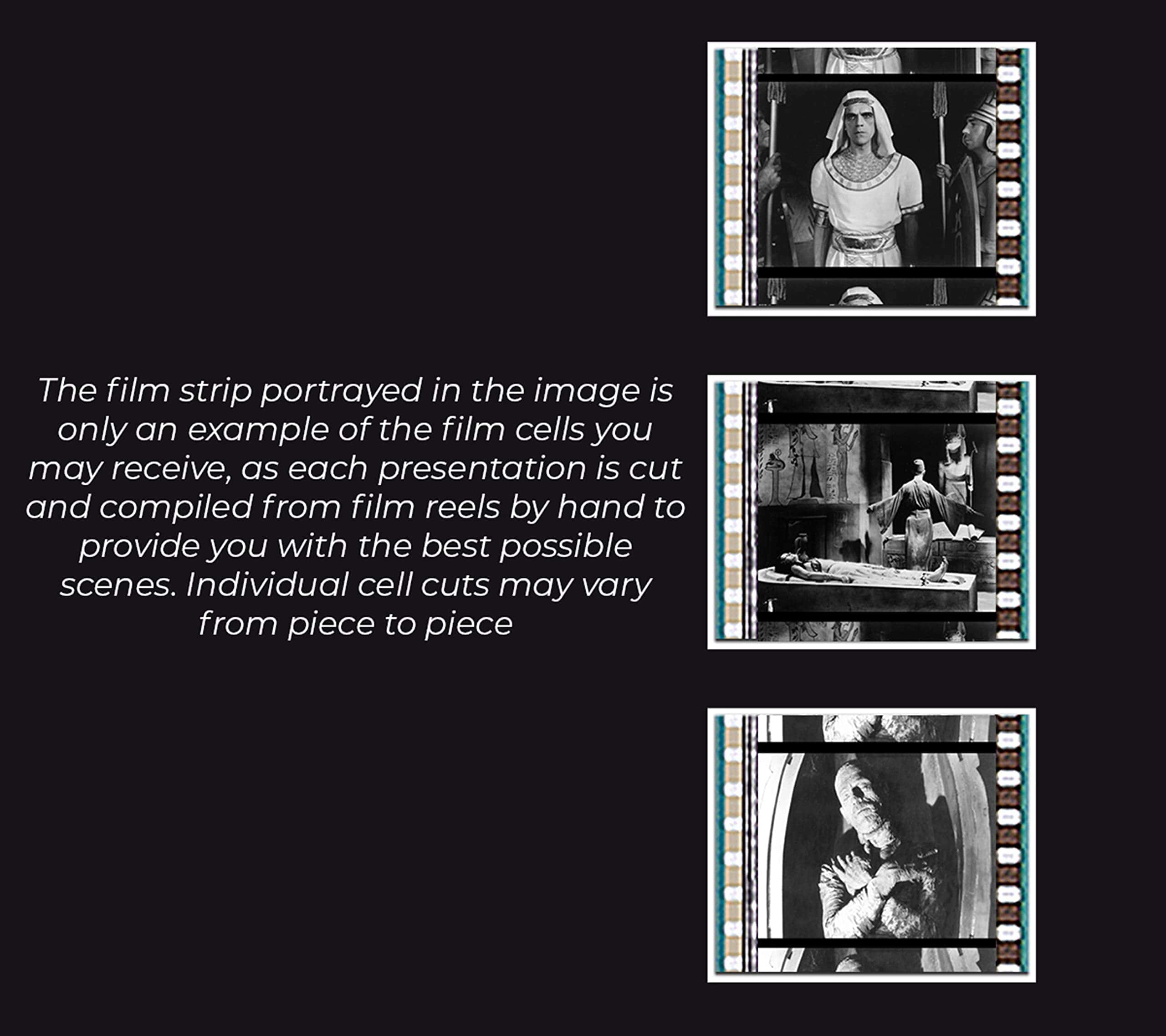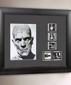Esta exhibición bellamente elaborada incluye 3 celdas de película de Karloff tomadas de una variedad de escenas en la película, montadas de manera que la luz pueda atravesarlas. La pieza también cuenta con una placa de descripción detallada e imagen compañera, todo está profesionalmente doble montado y enmarcado detrás de plexiglás. Su exhibición de celda de película clásica incluye certificación de autenticidad en el anverso, así como instrucciones de cuidado. Cada exhibición viene cuidadosamente empaquetada en una caja de fábrica protectora y cada pieza está cuidadosamente hecha a mano. Un increíble coleccionable para fans de los monstruos universales y del cine, ideal para coleccionistas y para pasar a futuros fans de cine.