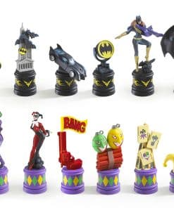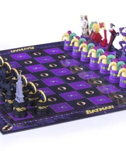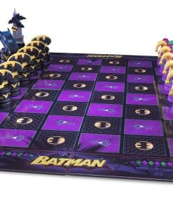 ¡Responde al llamado a la acción, derrota a los villanos y salva la ciudad de Gotham en este Juego de Ajedrez de Batman! ¿Ayudarás a Batman y Batgirl a salvar el día, o sembrarás el caos con villanos como El Joker y Harley Quinn? Eleva tu juego con este único juego de ajedrez que combina el mundo estratégico del ajedrez y la misteriosa ciudad de Gotham! Perfecto para jugadores de todos los niveles de habilidad. El tablero de ajedrez cuadrado de 18.5″ presenta un patrón de cuadros negro y morado, completo con alternancia de símbolos de murciélago y símbolos de Joker, adecuado para el juego de los reyes. Este set incluye 32 piezas de juego modeladas según tus personajes e items favoritos de Batman, incluyendo el Batimóvil y cartas de Joker. Oficialmente licenciado por Warner Bros. Para fans de Batman de 7 años en adelante.