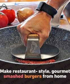 Es difícil superar al revolucionario Original Burger Iron, pero nosotros lo logramos. Conozca al legendario Sasquash: el máximo poder para aplastar hamburguesas. Deje que el Sasquash revolucione la forma en que cocina las hamburguesas con queso. Haga las hamburguesas gourmet más delgadas y crujientes desde la comodidad de su hogar con nuestro mango plano extra ancho para un mayor poder de aplastamiento. Simplemente suelte un trozo de carne molida en su sartén o plancha, y aplaste su camino hacia el paraíso de la hamburguesa. ¿Quiere llevar la construcción de hamburguesas al siguiente nivel? Combinelo con la espátula de plancha de uso rudo Sasquash y pongase a trabajar.