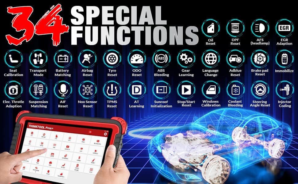 4. 34 funciones especiales de reinicio. El escáner ThinkTool PROS + admite la mayoría de las funciones de mantenimiento y reinicio comunes, RESET DE ACEITE, adaptación de ACCELEMENT, servicio de IMMO, codificación de inyectores, reinicio de pastillas de freno, reinicio de ángulo de dirección, sangrado ABS, reinicio AFS, sincronización de batería, reinicio TPMS, inicialización de techo corredizo, coincidencia de suspensión, aprendizaje de marchas, reinicio de airbag, reinicio ODO, reinicio de refrigerante, reinicio de sensor de óxido de nitrógeno, reinicio de parada/arranque, modo de transporte, reinicio de neumáticos, calibración de ventanas.