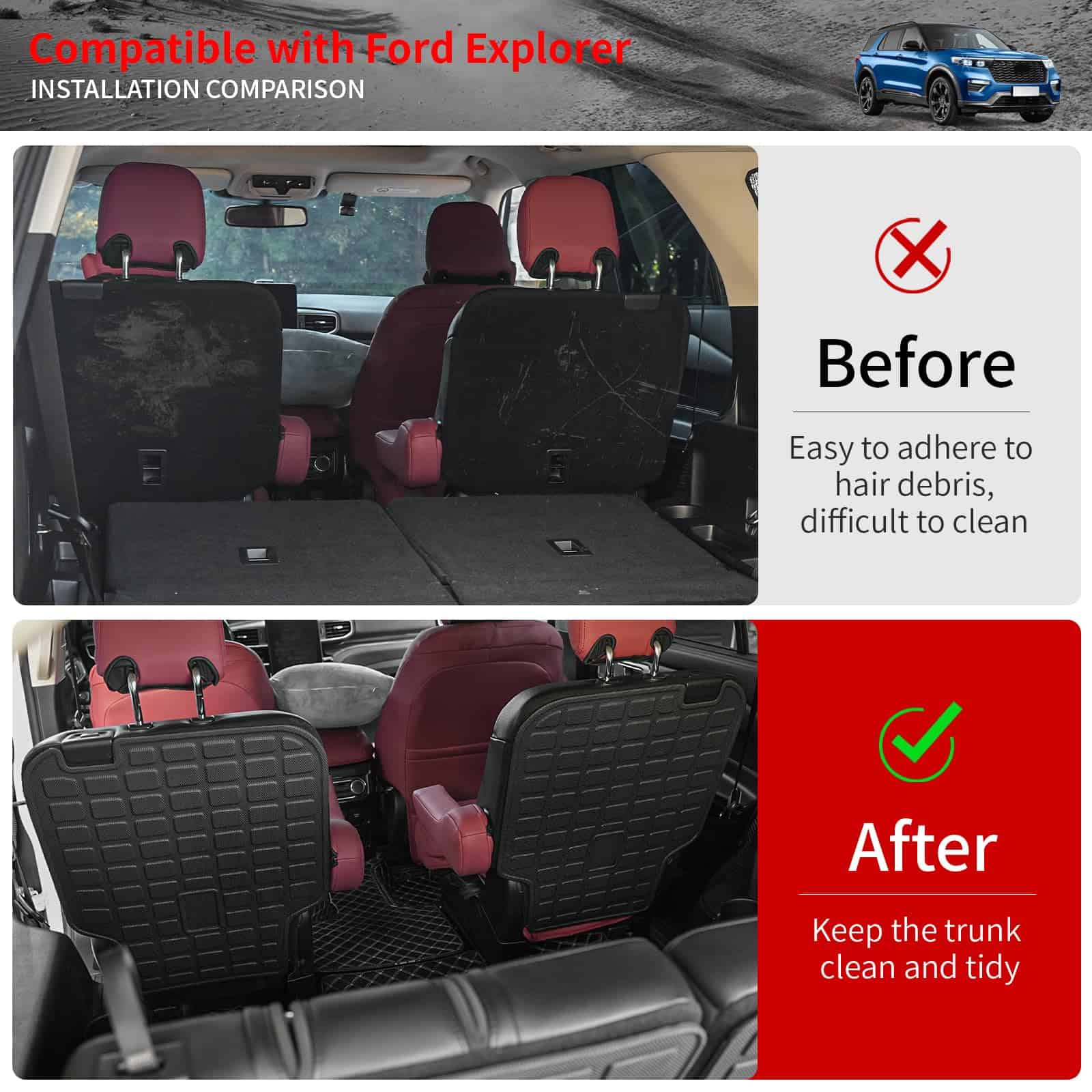 1. Ajuste: Este set (cubierta del asiento trasero de la 2da fila y alfombrilla de carga con tapetes del respaldo y tapetes para piso) está diseñado según el automóvil original y es compatible con Ford Explorer 6 Asientos 2020 2021 2022 2023 2024 2025. Atención: Este set solo es compatible con 6 Asientos, NO es compatible con 7 asientos. Por favor, verifique cuidadosamente antes de comprar.