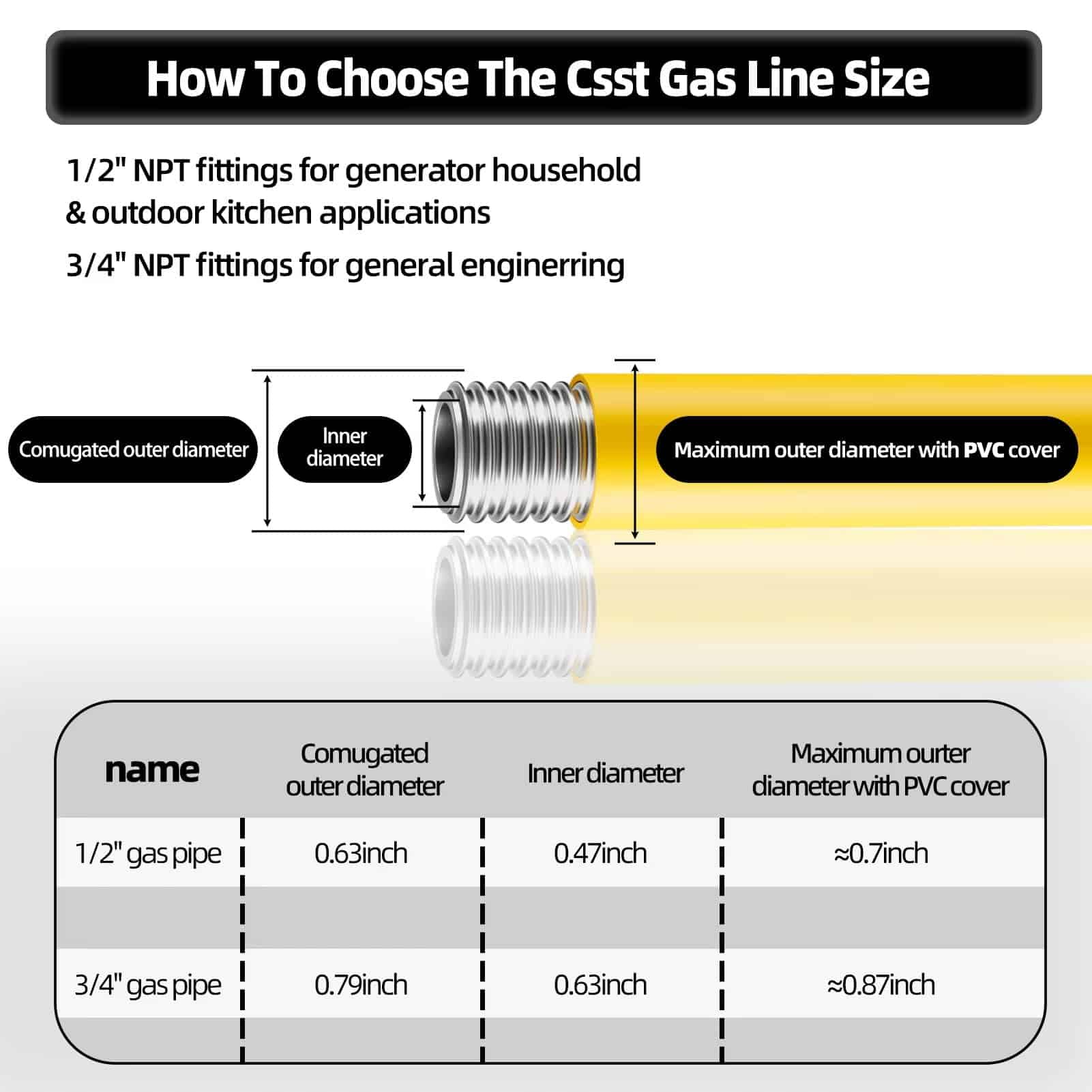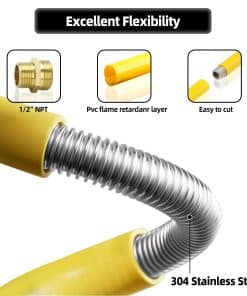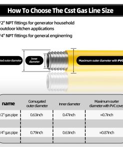 1. Manguera de gas CSST de 1/2 pulgada – La manguera de gas de 1/2 pulgada tiene una longitud total de 70FT, tamaño: 0.47″ / 12mm diámetro interno x 0.63″ / 16mm diámetro externo, tamaño ideal para estufas, secadoras, calentadores y sistemas de tuberías de gas subterráneas. La línea de gas natural es flexible y se puede cortar según sus necesidades con la opinión de un profesional antes de hacerlo, de lo contrario podría no funcionar.