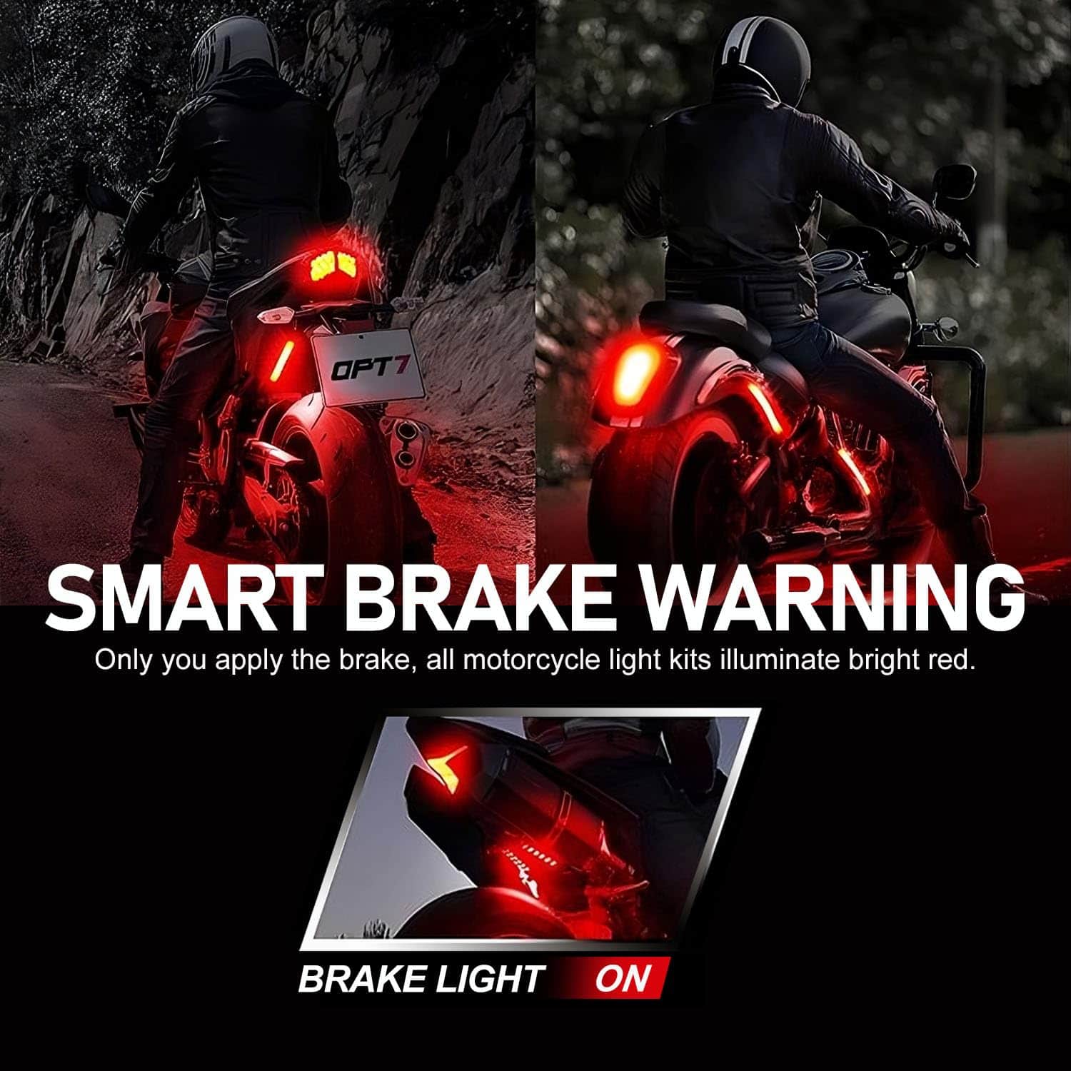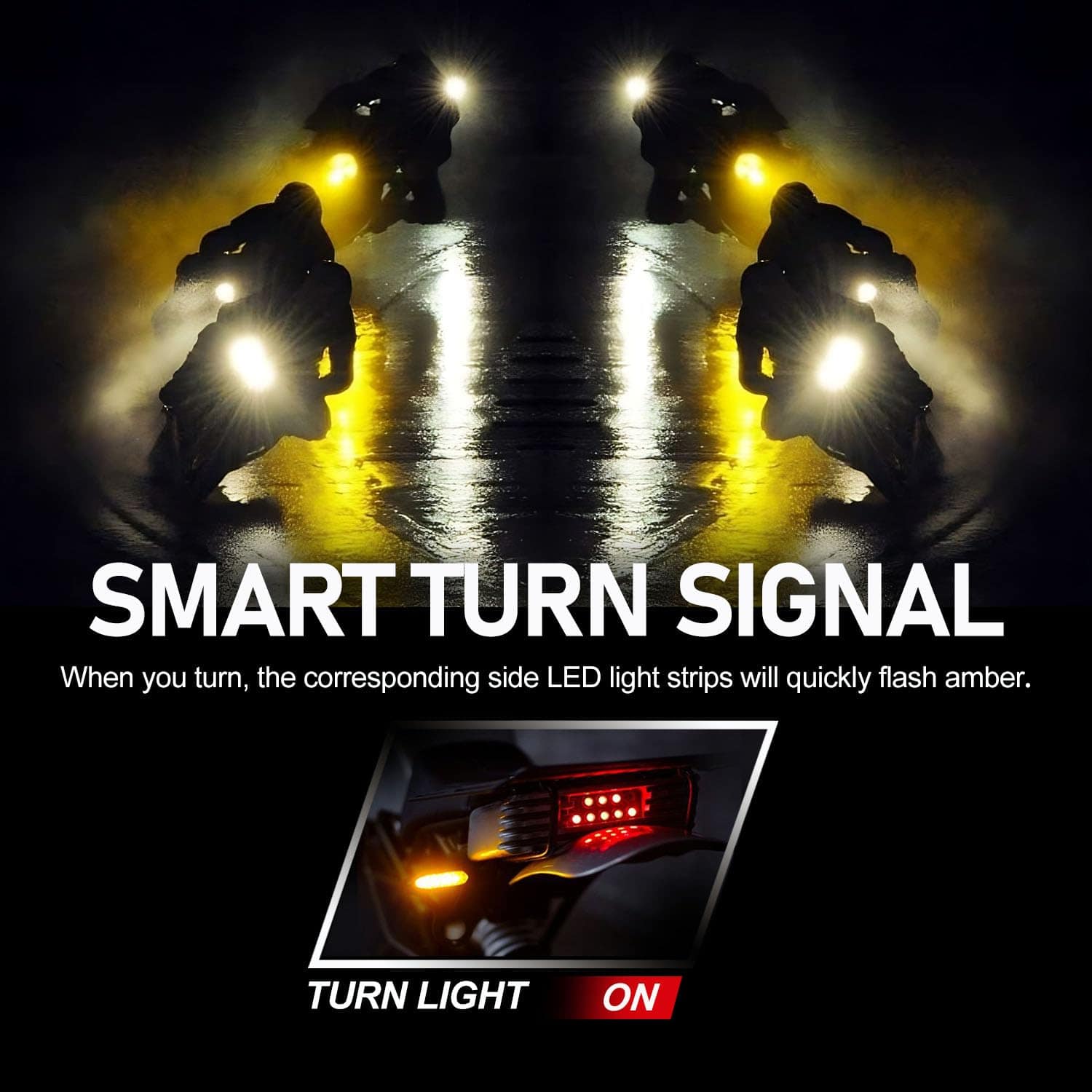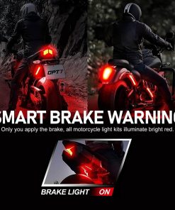 1. Función de Advertencia de Freno y Señal de Giro El kit de luces LED para motocicletas de 12PCS cuenta con funciones de advertencia de freno y señal de giro, haciendo que tu conducción sea más segura (especialmente durante la noche). Todas las luces de la motocicleta se iluminan de rojo brillante al frenar y automáticamente vuelven al modo anterior al soltar el freno. Al girar, las tiras de luces LED laterales correspondientes parpadearán rápidamente de color ámbar para ayudar a otros vehículos a identificar rápidamente tu comportamiento de conducción (Ambas funciones pueden ser añadidas o no, y no afectarán al uso general).