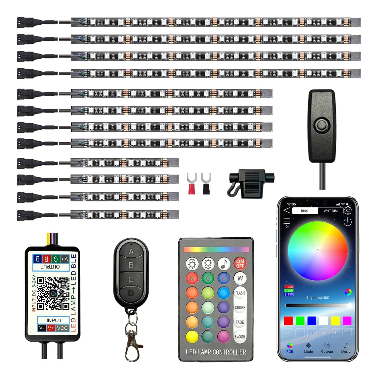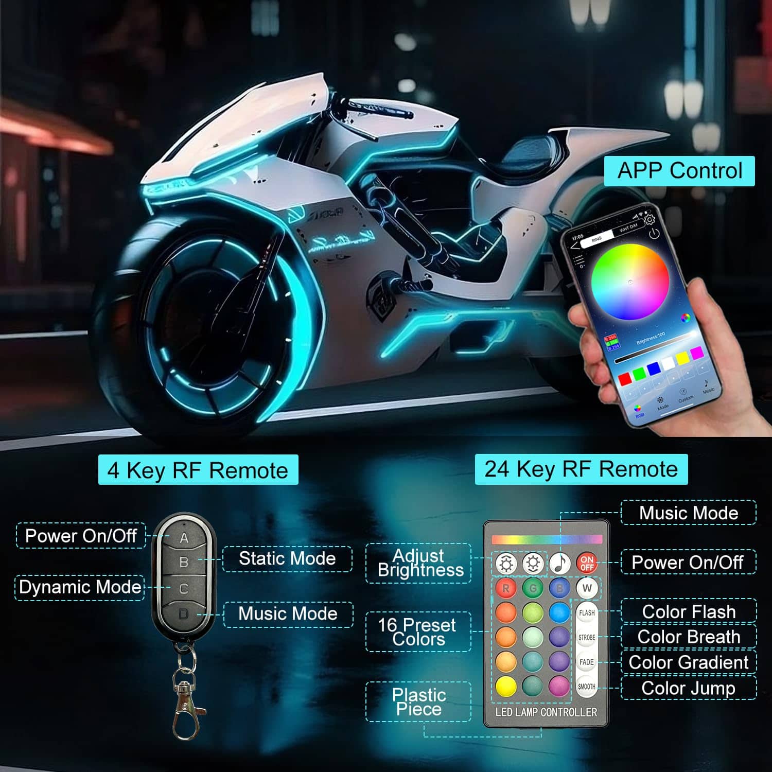 3. 3 Métodos de Control y Botón de Encendido La tira de luces LED para motocicleta bajo el chasis proporciona control de la app de teléfono celular Bluetooth y 2 controles remotos IF + RF fáciles de llevar. La app puede personalizar el color, selección de modo 29, modo musical y funciones de temporización. El control remoto de 24 teclas/4 teclas puede controlar el encendido/apagado, cambios de color estático, cambios dinámicos y modo musical, que son dos formas convenientes de controlar las luces de tu motocicleta. Además, el cómodo botón de encendido te permite apagar la alimentación después de la conducción, sin preocuparte por agotar la batería.