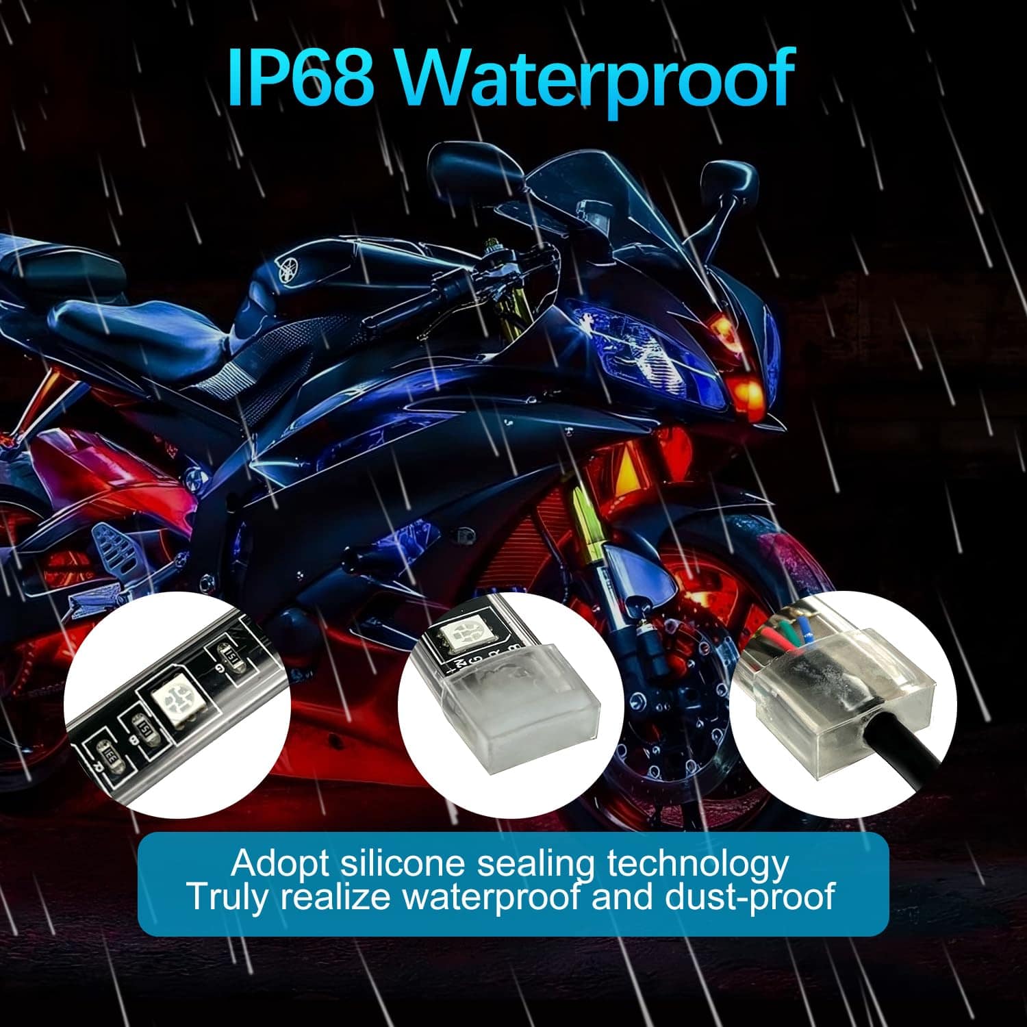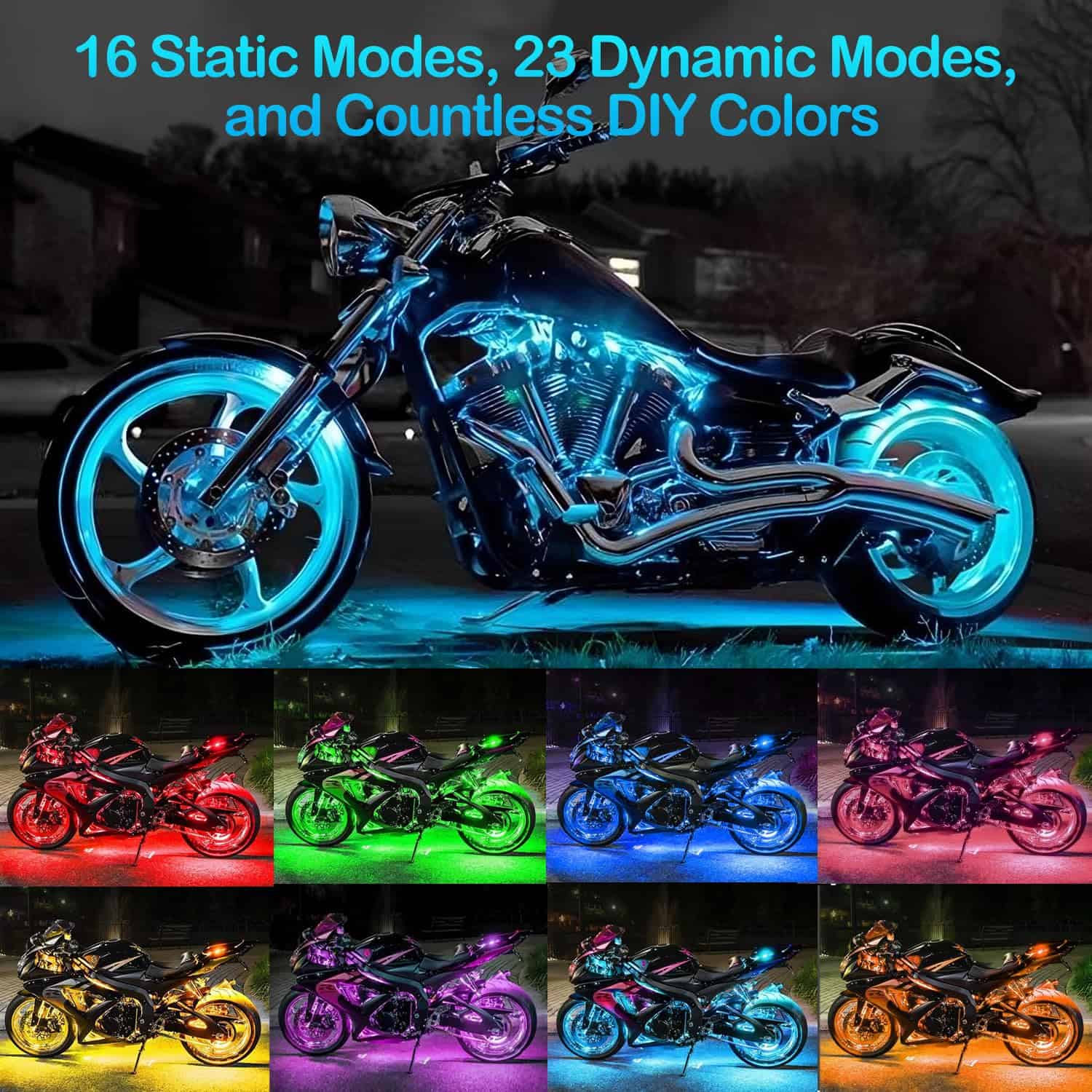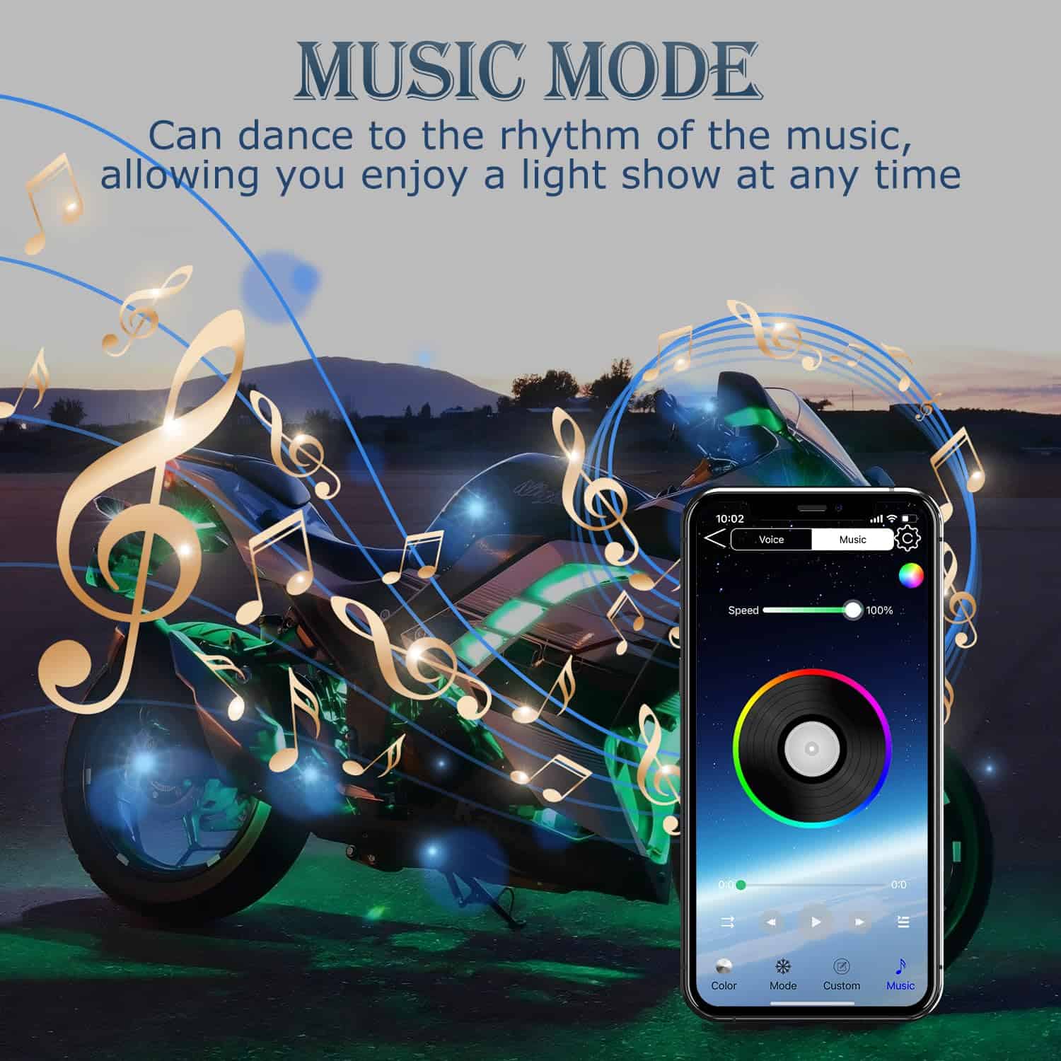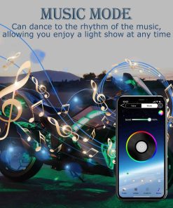 2. LED de Alta Luminosidad y 16 Millones de Colores La tira de luces para motocicletas utiliza perlas LED SMD5050 RGB de alta luminosidad y tecnología completamente sellada, más brillante e impermeable IP68. Puede crear 16 colores estáticos, 23 modos deslumbrantes como saltos, degradados y parpadeos, y 16 millones de colores DIY para que tu motocicleta sea más genial y brillante. El modo musical puede hacer que la tira de luces para motocicletas lata al ritmo, permitiéndote a ti y a tus amigos disfrutar de un espectáculo de luces deslumbrante al aire libre.