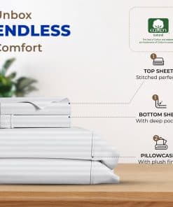 ¿QUÉ HAY EN EL PAQUETE 1 Sábana Plana de 81 cm de ancho x 96 cm de largo 1 Sábana Ajustada de 54 cm de ancho x 75 cm de largo + 16″ bolsillo profundo 2 Fundas de Almohada Estándar/Queen (21 cm de ancho x 32 cm de largo). DETALLES CLAVE: 100% Algodón Egipcio de Fibra Larga para una mejor suavidad y comodidad | Tratamiento Mercerizado para mejorar el brillo, profundidad del color y resistencia de la tela Acabado con un tejido de satén lustroso para una sensación suave como la mantequilla | Certificado como ESTÁNDAR 100 POR OEKO-TEX Detallado faldón de 4 pulgadas en la sábana plana y fundas de almohada y bolsillos profundos de 16 pulgadas en las sábanas ajustadas EL JUEGO DE SÁBANAS DE 100% ALGODÓN EGIPCIO DE ALTA CALIDAD Y SUPER SUAVE: Utilizamos el mejor algodón egipcio 100% y hilamos meticulosamente cada hilo para obtener una textura refinada y más suave. El tejido de satén aporta suavidad cremosa que se siente excepcional en la piel para un sueño glorioso. Luego, pasamos al proceso de mercerización para aumentar el brillo de la tela y producir colores más brillantes y más profundos que los colores de otros juegos de sábanas. La tela mercerizada también es resistente a la decoloración, la formación de bolitas y la contracción, y mantiene el color original después de cada lavado. ATENCIÓN DETALLADA: Nuestra sábana para cama completa pasa por las manos de artesanos hábiles para detallar meticulosamente un hermoso faldón de 4 pulgadas en la sábana plana y sábanas ajustadas con bolsillos extra profundos para un colchón ajustable de 8 pulgadas a 18 pulgadas. El pespunte en sobrehilado en las costuras evita que la tela se frunza y deshilache. Las etiquetas inteligentes permiten que cualquier persona haga la cama fácilmente, con un lado corto y largo etiquetado en la sábana. NOS PREOCUPAMOS POR TI: Provenientes de procesos puros y orgánicos, nuestras sábanas de algodón egipcio 100% para cama completa son sostenibles. Nuestras sábanas completas de algodón para enfriar están certificadas como ESTÁNDAR 100 POR OEKO-TEX para garantizar que no haya productos químicos dañinos o toxinas en tus sábanas de algodón. INSTRUCCIONES DE CUIDADO: Lavable a máquina. Secar a baja temperatura o colgar estas sábanas de algodón para secar. Dobla suavemente nuestras sábanas de cama completa después de quitarlas de la secadora para evitar arrugas.