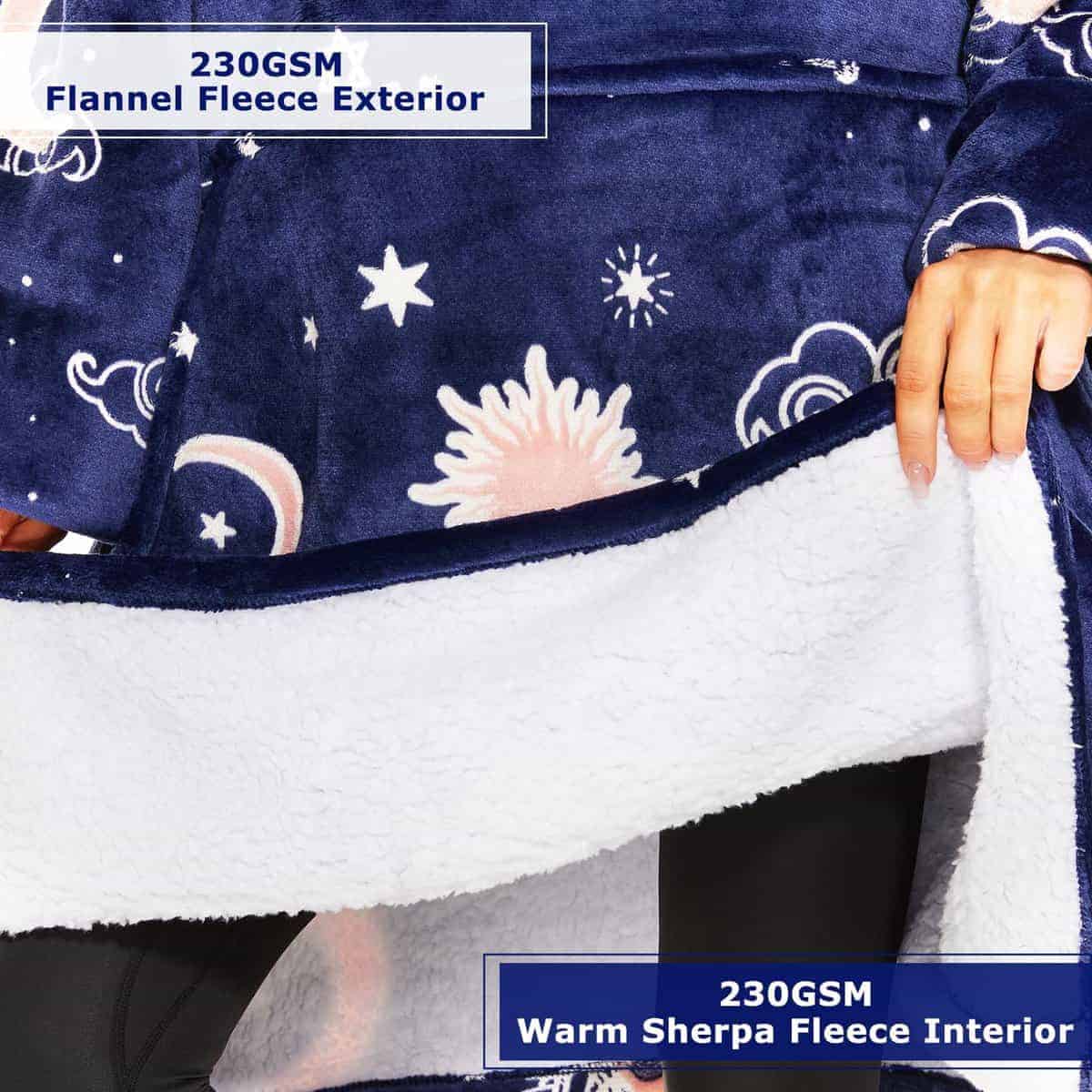 3. Diseño Altamente Detallado: La manta con capucha de sherpa de THREE POODLE tiene un diseño de una sola pieza. El gran bolsillo canguro en frente de la manta suéter mantiene las manos calientes y brinda un lugar conveniente para sostener controles remotos, teléfonos celulares, etc. Tu cabeza se mantiene caliente con una capucha espaciosa. Cuando paseas afuera o cocinas, los puños elásticos mantienen el viento fuera, evitando que se resbalen. Además, el diseño extragrande brinda la mayor movilidad.