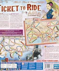Introduciendo la Colección de Mapas de Ticket to Ride – una nueva serie de expansiones de Ticket to Ride que presenta 2 mapas diferentes de Ticket to Ride en un tablero de doble cara. Ticket to Ride Asia es el primer volumen de la Colección de Mapas. Te embarcarás en una increíble aventura en el mapa del Equipo Asia de Alan R. Moon. Específicamente diseñado para hasta 6 jugadores, tú y un compañero se unirán contra otros grupos en un salvaje recorrido de 25,000 km desde Kabul hasta Beijing, pasando por las estepas de Mongolia y el desierto de Gobi hasta el río Amarillo. O, si prefieres los placeres tranquilos de viajar solo por la Ruta de la Seda o trazar tu camino a través del ajetreo y bullicio de Indochina, aventúrate en Legendary Asia. Prepárate para un emocionante viaje por los pasos de montaña del Himalaya.