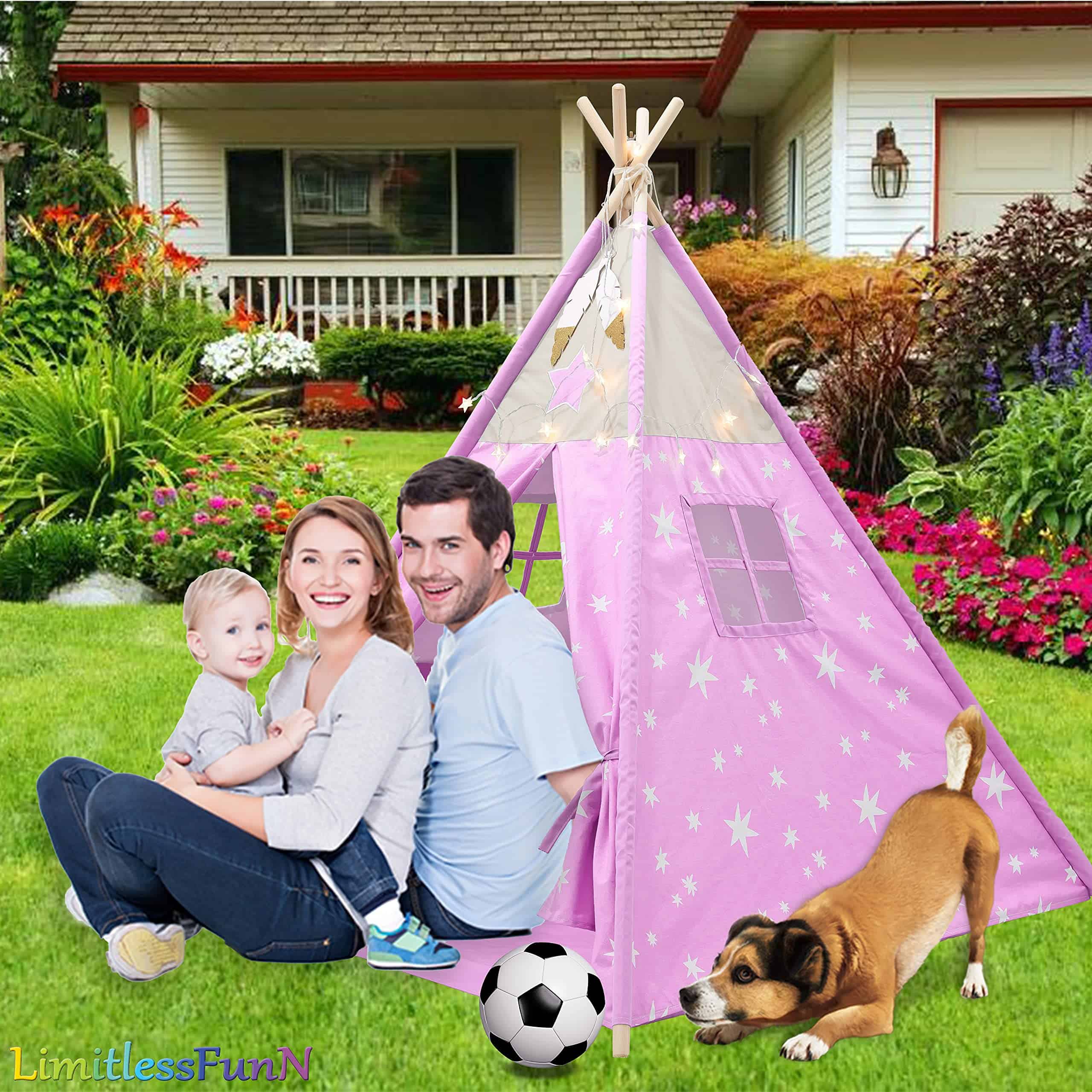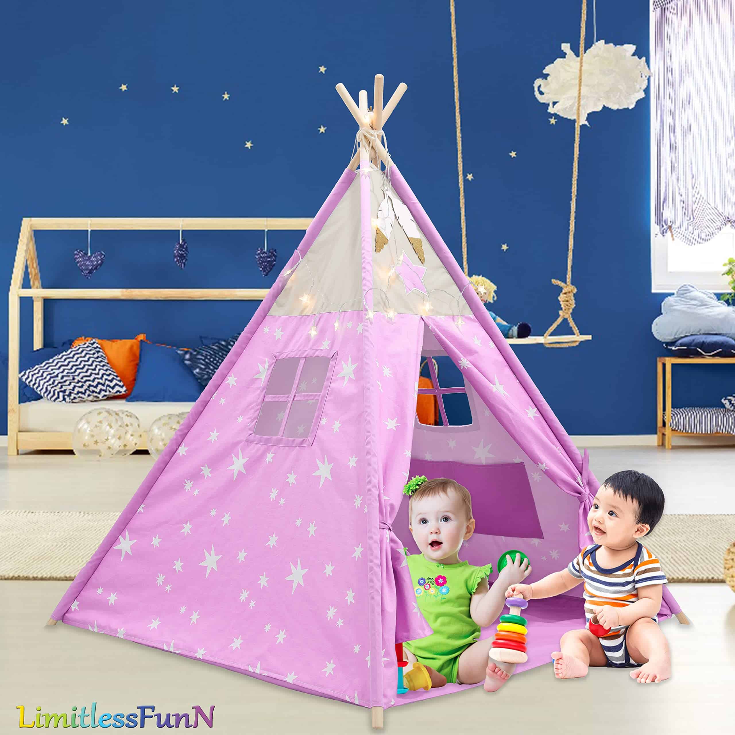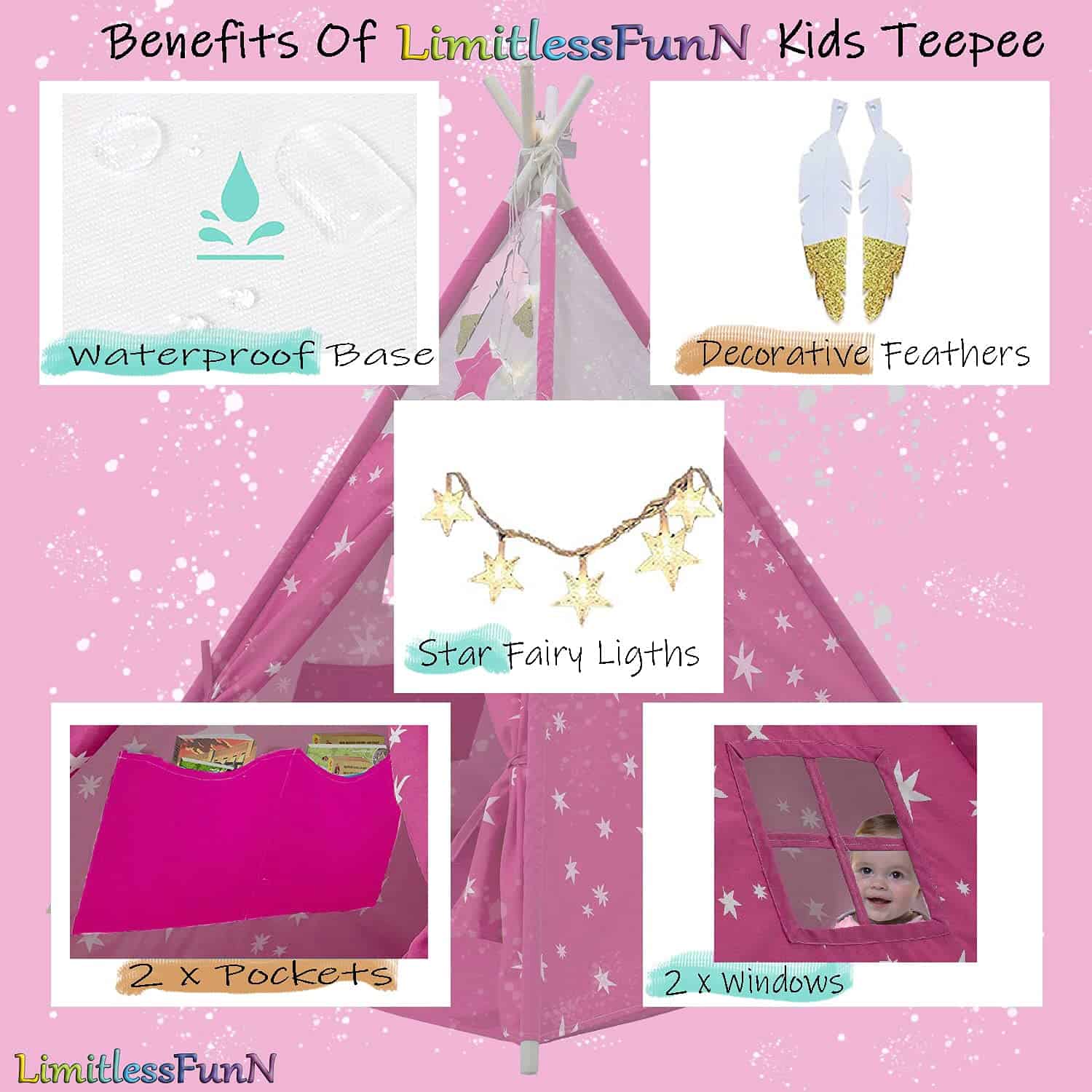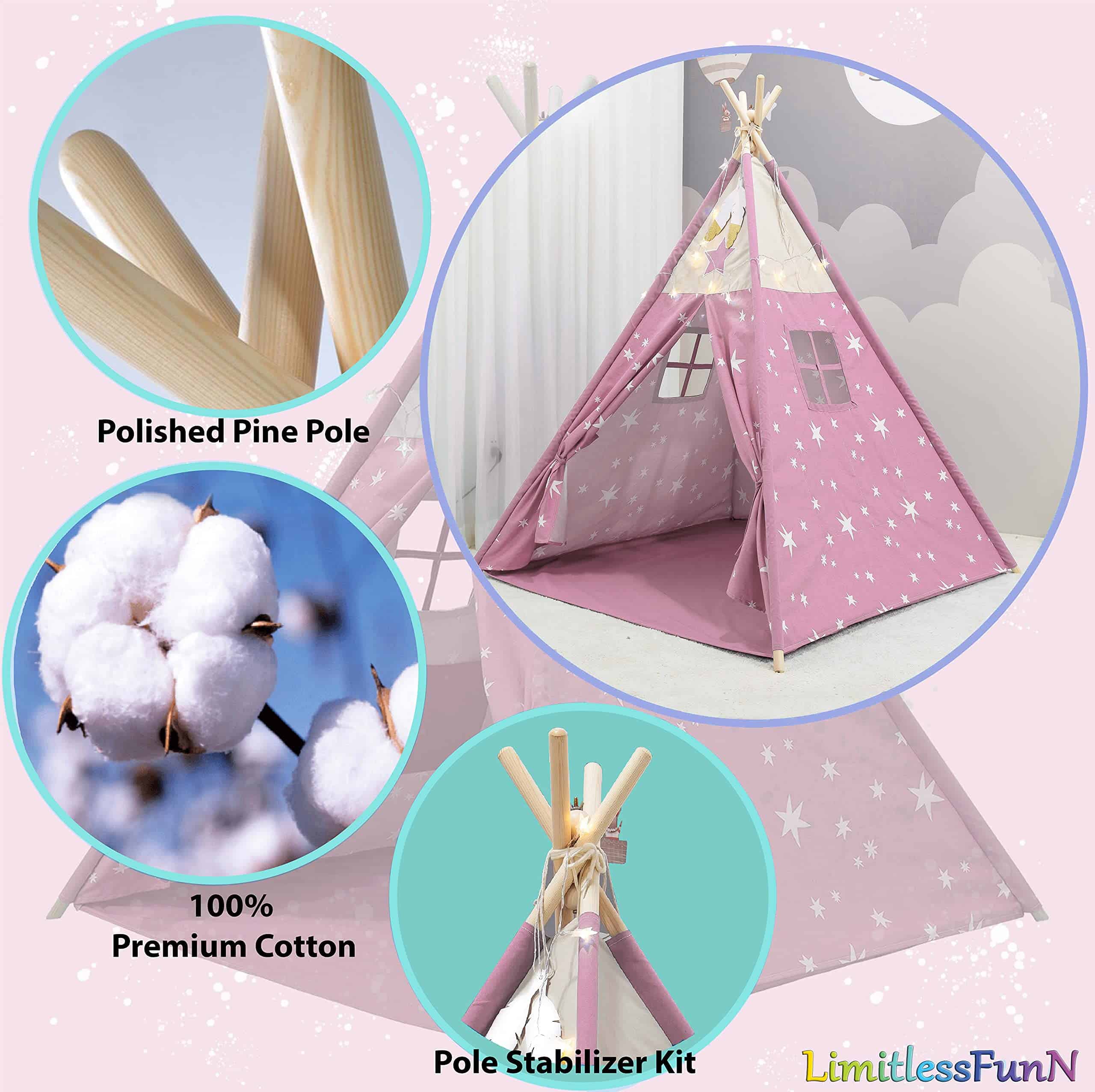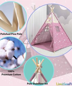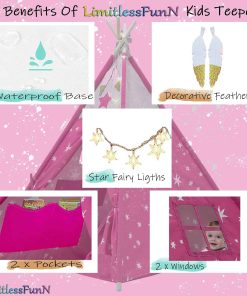 1. MEJORA LA CREATIVIDAD Y LA IMAGINACIÓN La lugar perfecto para relajarse y soñar todo el día! La tienda de juego LimitlessFunN tiene un diseño colorido y amigable para los niños. Deja que tus hijos experimenten una aventura mágica en actividades tanto en interiores como en exteriores. 2. PROPORCIONA A LOS NIÑOS SU PROPIO ESPACIO PRIVADO Todo el mundo necesita un poco de espacio solo para ellos mismos. Dale a tu hijo un lugar divertido para jugar o dormir. Ideal para dormitorios, salas de juegos, centros de cuidado diurno, escuelas, pijamadas o parques. Despliégala en el patio trasero, y tendrán una cueva mágica, un fuerte que defender o un lugar secreto para esconderse. Con la puerta abatible y ventana de observación, es ideal para fomentar el juego de roles, la aventura y la diversión. 3. FÁCIL Y RÁPIDA DE ENSAMBLAR ¡Se arma en segundos! No se requiere montaje ni accesorios. Solo despliégala e inserta las varillas de soporte para mayor estabilidad. Las varillas se insertan desde la parte inferior de la tienda en mangas ocultas para máxima seguridad. Cuando se arma, el tamaño de la tienda tipi es de 48″x48″x60″ y cuando es hora de limpiar, el castillo se pliega completamente para caber en una caja ligera y portátil. Se pliega de forma compacta para un almacenamiento fácil. 4. ALTA CALIDAD La Tienda Tipi de LimitlessFunN está diseñada con tela de algodón de alta calidad de 240 g con una base impermeable, postes de madera de 23 mm, ventanas laterales transpirables con cortinas y suficiente espacio para que jueguen 2-3 niños pequeños, asegurando a tus hijos la máxima seguridad, durabilidad y experiencia placentera por horas de juego.