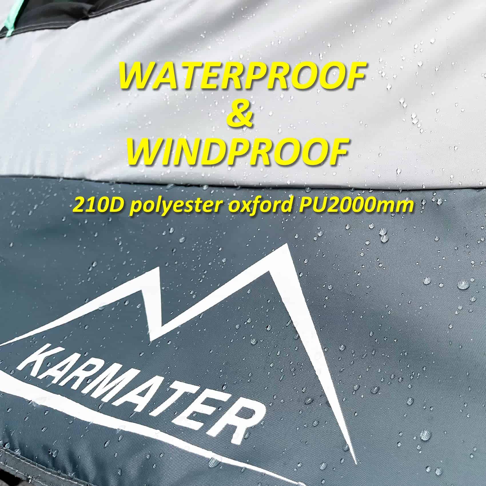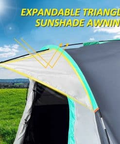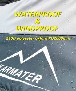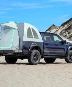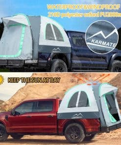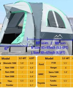 Construida con material de poliéster Oxford PU2000mm, con un recubrimiento impermeable adicional PU2000, garantiza una protección completa contra la lluvia sin necesidad de un toldo adicional. Viene con una capa impermeable en la parte inferior para prevenir la infiltración de agua de lluvia. Con sus robustos postes de fibra de vidrio, puedes estar seguro de que tu tienda permanecerá en pie en condiciones climáticas extremas. Disfruta de la privacidad que necesitas con el diseño de doble capa con 3 ventanas. Baja la capa de sombreado por la noche para una oscuridad completa y cierra la capa de malla durante el día para mantener fuera el polvo y los escombros. No te preocupes por la circulación de aire o sentirte sofocado, ya que cada tienda tiene una puerta de entrada grande y 3 ventanas que proporcionan una excelente ventilación. Especificamente diseñada para camas de camionetas de 5.5-6 pies, las dimensiones exteriores miden 83′ (Profundidad) 67′ (Ancho) 69′ (Altura) para un ajuste perfecto. Amplio espacio interior de 67» y altura de 69», lo que te permite descansar bien por la noche para dos personas. 2 bolsillos de malla convenientemente ubicados en la tienda para almacenar tus pequeños objetos y mantener ordenado tu campamento. Los postes codificados por colores son fáciles de identificar, vienen con instrucciones de instalación y una bolsa de almacenamiento, instalar tu tienda nunca ha sido tan fácil. Presta atención al instalar los postes para asegurarte de que estén conectados de forma segura para una durabilidad y estabilidad máximas. Aprovecha tus viajes con menos tiempo dedicado al montaje!.