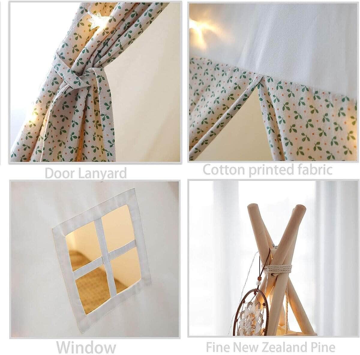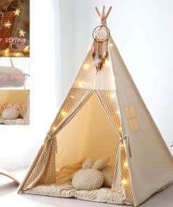 Nuestro producto no incluye cojines. Por qué tu hijo necesita una tienda de campaña para niños. La tienda de campaña teepee puede proporcionar a los niños un espacio más cálido y confortable para jugar, leer, imaginar y descansar. Los niños pueden disfrutar de privacidad y espacio personal, mientras los padres pueden ver a sus hijos en las tiendas en todo momento a través de la pequeña ventana. Instalación simple, necesitas aproximadamente 3~5 minutos para instalarla, se puede guardar fácilmente después de su uso, como un paraguas. Se puede utilizar en fiestas, bodas, dormitorios, aulas, hoteles. Puedes regalárselo a tus hijos, puedes usarlo como un producto con características locales, como adorno. Si hay algún problema de calidad, lo devolveremos incondicionalmente en 90 días. Esta es nuestra mayor confianza en la calidad del producto. Los tejidos de algodón natural puro que utilizamos, así como la madera de pino de Nueva Zelanda, han pasado por una desinfección a alta temperatura, y tienen todos los indicadores calificados, para que el bebé pueda divertirse y la madre pueda usarlo con tranquilidad. El origen del producto proviene de los antiguos indios, es muy misterioso, lleno de colores, y puedes hablar sobre historia y cultura con los niños.