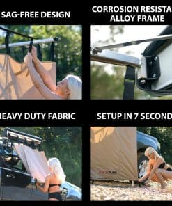 Especificaciones de la tienda de ducha KickAss Ensuite: Peso: 15 libras – Tamaño cerrado de 44 1/8″ x 6 1/2″ x 12 3/4″ – Tamaño abierto de 41 3/8″ x 41 3/8″ x 82 3/4″ – Columna de agua de 59 1/8″ a 78 3/4″ – Tejido: poliéster ripstop de 300D: impermeable y resistente al agua. Bolsa de viaje resistente a los rayos UV de PVC de 1000D – Marco de aleación Grado 6063: Aleación de aluminio 6063 (Aleación 6063: Comúnmente conocida como una aleación arquitectónica.) – Cremallera YKK10 – Accesorios: bolsillo de malla, soporte para cabezal de ducha de velcro
