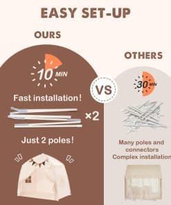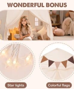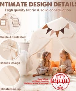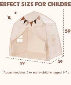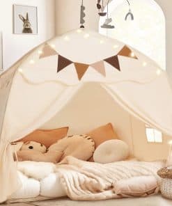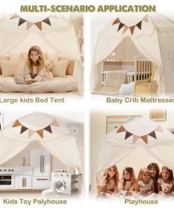 Nota: nuestro tamaño de tienda es 150x100x150 cm, por favor, elija un colchón adecuado, especialmente cuando use un colchón gemelo. DISEÑO ATRACTIVO: Nuestra tienda para niños presenta una forma única de castillo con cúpula y está equipada con ventanas dobles para una excelente ventilación. Además, la tienda interior incluye amarres para un fácil acceso. Fabricada con tela de poliéster premium con costuras meticulosas, esta tienda de juegos para niños garantiza una durabilidad duradera. FÁCIL MONTAJE Y DESMONTAJE: Esta tienda para niños es muy fácil de instalar con su montaje de 2 pasos, no se necesitan herramientas, solo dos postes. Además, el desmontaje y montaje conveniente lo hacen perfecto para la diversión sobre la marcha. Esta tienda para niños es portátil, plegable y ocupa un espacio mínimo. Ya sea para reuniones, parques, guarderías, picnics, excursiones o juegos de interior, los niños lo adorarán. TELA DE PRIMERA CALIDAD Y ESTRUCTURA RESISTENTE: Esta casa de juegos presenta tela de poliéster de alta calidad y lavable a máquina, garantizando comodidad y fácil limpieza profunda. El resistente marco de varillas de fibra de vidrio está diseñado para soportar el juego activo y resistir durante un período prolongado. La casa de juegos está construida para resistir daños por uso y puede soportar altas temperaturas sin problemas. TAMAÑO PARA UNA TIENDA DE CAMA ACOGEDORA: Nuestra tienda de juegos ofrece un generoso espacio de 150x100x150 cm, que puede acomodar a 5 o más niños de 1 a 7 años. Su habitación espaciosa incluso puede adaptarse a un colchón de bebé y una cuna de bebé. La tienda para niños crea un espacio cómodo para que los niños se relajen, jueguen, lean, aprendan e incluso organicen una fiesta. Es una excelente opción para los niños al jugar al aire libre o mientras viajan. REGALO IDEAL: La tienda para cama de bebé viene con extras divertidos como banderas coloridas y luces de estrella para una mayor diversión. Sus colores neutros y telas texturizadas la convierten en un regalo perfecto tanto para niños como para niñas. Nuestro tienda de exterior viene con un servicio al cliente profesional. Si tiene alguna pregunta o inquietud, contáctenos. Le responderemos en 24 horas y haremos todo lo posible para solucionar las cosas.