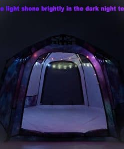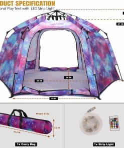 La tienda de juego para niños en forma hexagonal es perfecta para proporcionar un espacio divertido y privado para que los niños jueguen. Hecha de materiales resistentes y duraderos, la tienda es suave al tacto, fácil de limpiar y transpirable. La tienda puede acomodar de 4 a 5 niños para jugar en su interior, brindando un amplio espacio para la diversión. Además, la instalación es sumamente sencilla gracias al diseño de varilla de resorte que permite que la tienda se abra automáticamente en solo 3 segundos. Con las luces LED coloridas, los niños pueden disfrutar de un ambiente mágico y soñador, como si estuvieran explorando la Vía Láctea. La tienda también cuenta con cuatro ventanas para una adecuada ventilación y para que los padres puedan supervisar la seguridad de sus hijos. Con una garantía de un año y un servicio al cliente amigable, este producto es una excelente opción para regalos de cumpleaños o simplemente para que los niños disfruten de su propio mundo de juego.