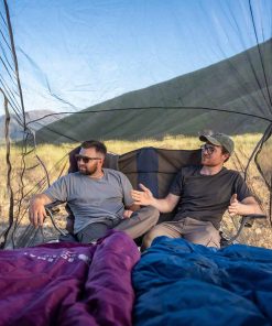 Si deseas tensar la pantalla, simplemente une las líneas de nylon incluidas a los bucles de expansión cosidos, que se encuentran aproximadamente a la mitad de la parte trasera de la tienda, y clávalas cuando estén tensas.