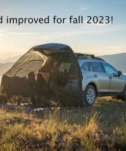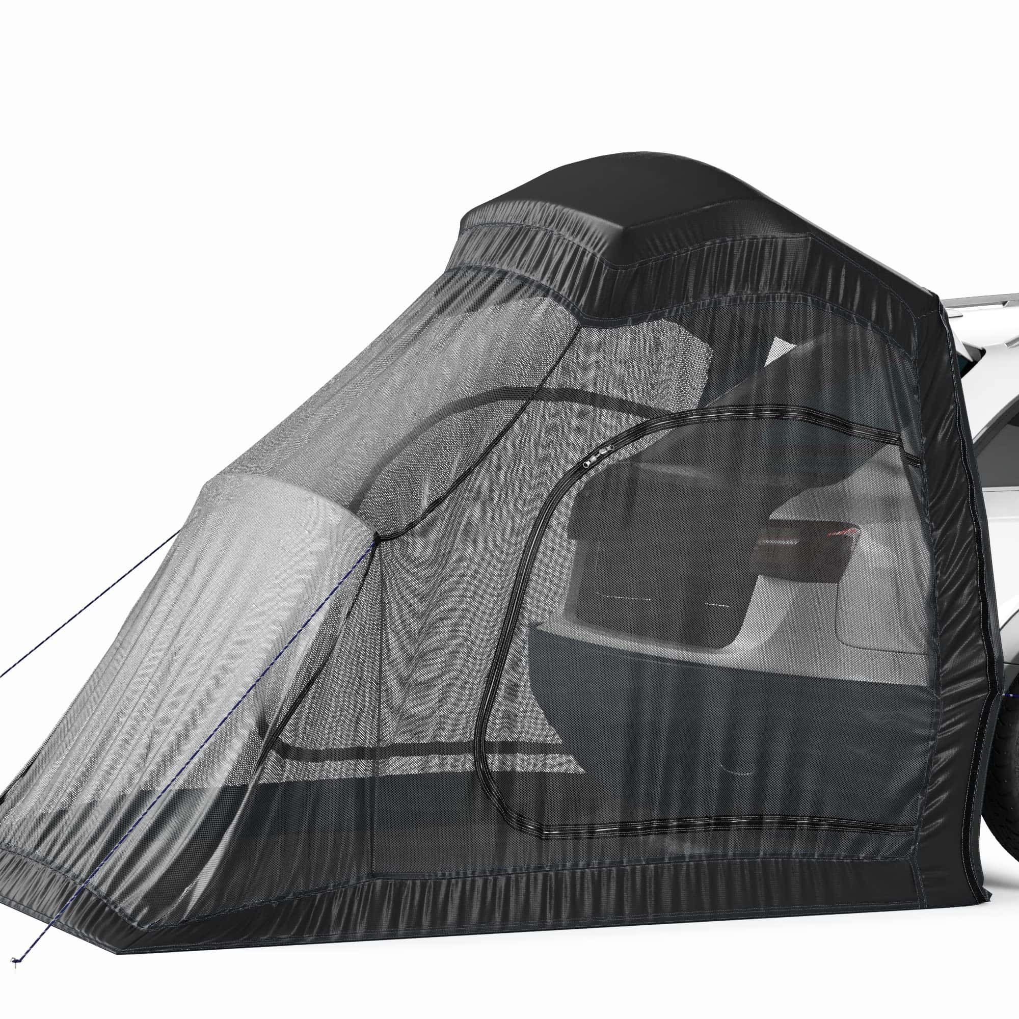 Instrucciones para la configuración: Tira la abertura de la tienda sobre la puerta de tu hatchback, luego clava las esquinas de la tienda. Para eliminar la holgura de la pantalla, simplemente ata las dos líneas de nylon incluidas a los bucles de expansión cosidos, luego clávalas.