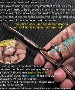 1. Para nuevos usuarios de tijeras de cabello profesionales: La forma correcta de sostener las tijeras de cabello y usarlas (no es lo mismo que las tijeras domésticas), es muy importante para cortar el cabello fácilmente. Por favor, vea las instrucciones de operación en la sexta foto.