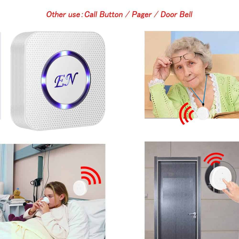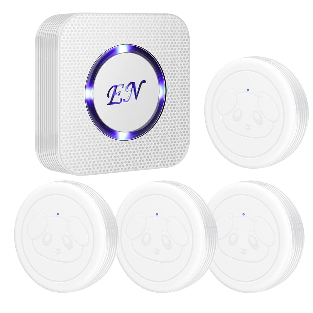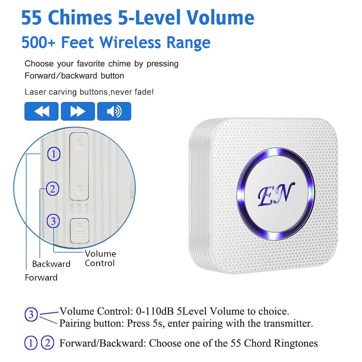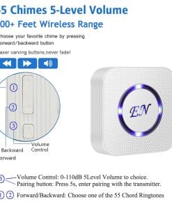 El timbre para perros Evernary es de fácil instalación y diseño moderno y elegante. El receptor enchufable: Simplemente conéctelo a un tomacorriente. Los transmisores: ¡Solo colóquelos donde los necesite! Se pueden colocar en la puerta/suelo/pared para un uso fácil con una pata o una nariz, sin dañar la pared. De hecho, incluso podemos colocarlo en un pequeño tablero y dejarlo allí junto a la puerta o donde nos guste. Cuando estamos entrenando a nuestro perro, podemos colocarlo donde sea necesario. Puedes hacer tu entrenamiento durante la hora de comer. Coloque la comida fuera de la puerta y luego muestre al perro cómo tocar el timbre. Cuando lo hagan, elógielos e inmediatamente abra la puerta. ¡Saca a tu perro cada vez que toque el timbre, ya sea que quieran hacerlo o no! El cachorro tocará el timbre y cuando me acerque para dejarlo salir, tal vez no quiera salir, solo quiera jugar. ¡Así que sácalos de todos modos! Si eres consistente al respecto, solo tocarán el timbre cuando quieran salir. Parámetros técnicos. Voltaje de trabajo del receptor enchufable: 110-260V. Batería del transmisor: batería alcalina 12V 23A (incluida). Temperatura de funcionamiento: -30 C ~+70 C. Grado de impermeabilidad del transmisor: IP55. Rango de operación: más de 500 pies (área abierta). VOLUMEN: 5 niveles (0-110 dB), modo único sin silencio, dando a los usuarios una mejor experiencia en el hogar. 55 tonos de llamada: El método de emparejamiento es simple. Los usuarios pueden configurar cualquier música como tono de timbre según la preferencia personal.